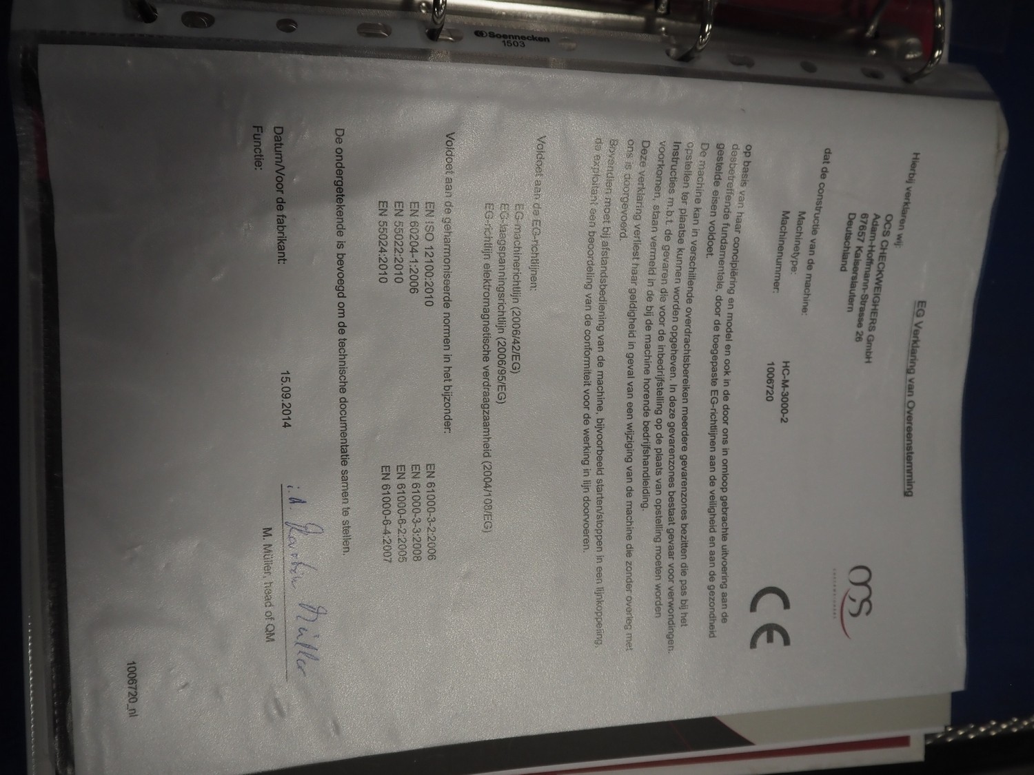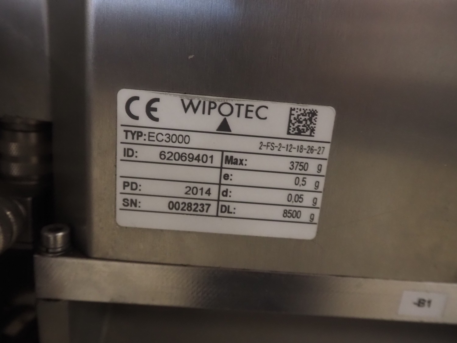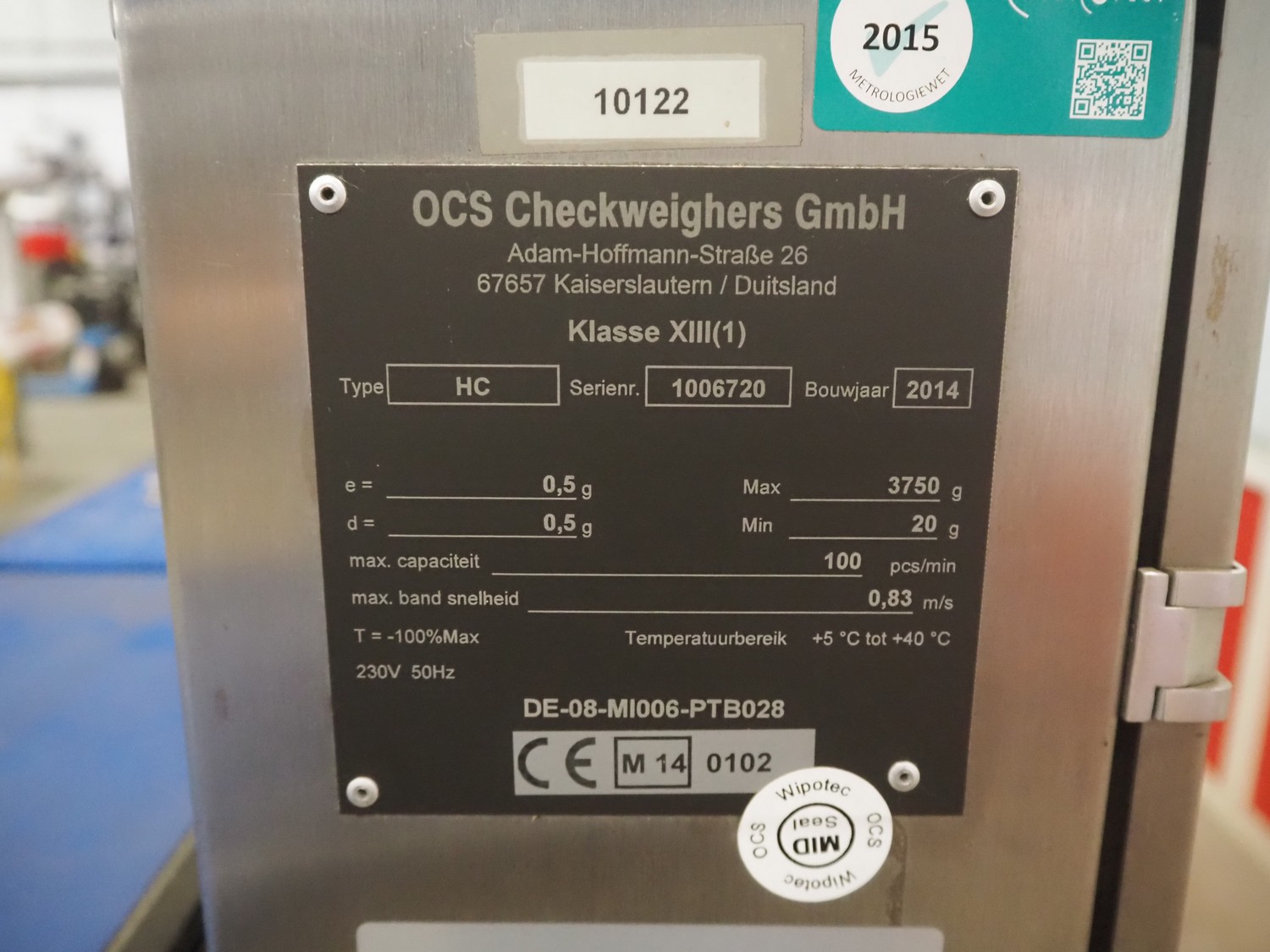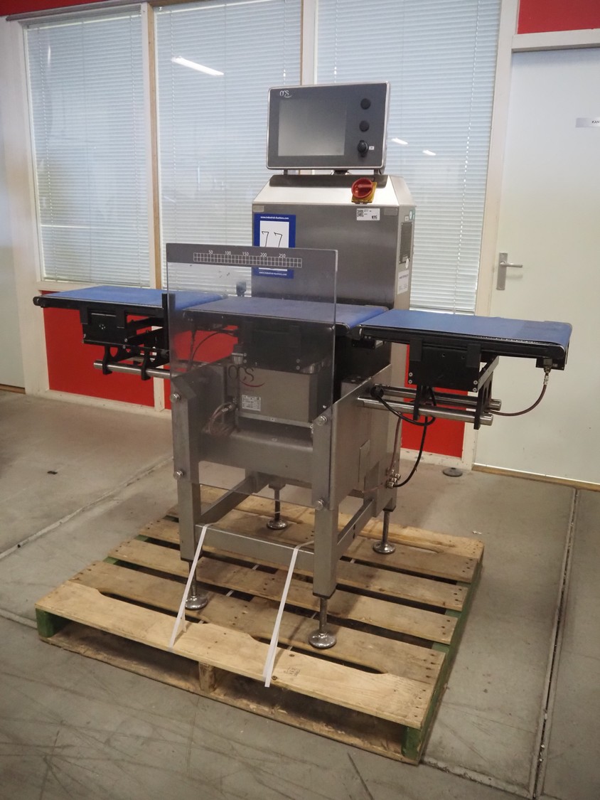 OCS checkweigher, type: HC, serial number: 1006720, year of construction: 2014, 230 V, 50 Hz, e = 0.5 g, d = 0.5 g, minimum weight: 20 g, maximum weight: 3750 g, capacity: 100 pcs/min, plastic belt, belt width: 300 mm, total dimensions: 1550 mm x 750 mm x 1520 mm.