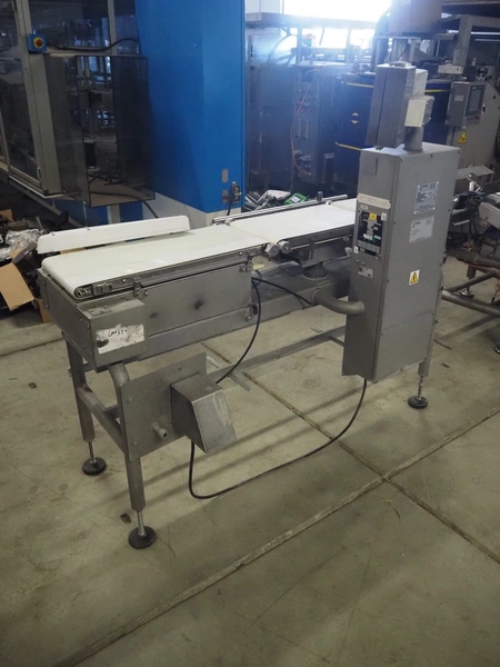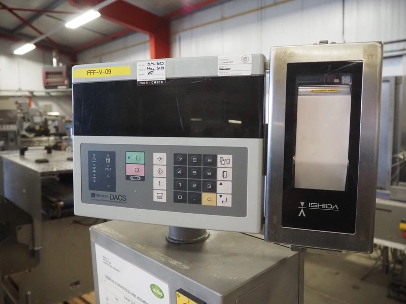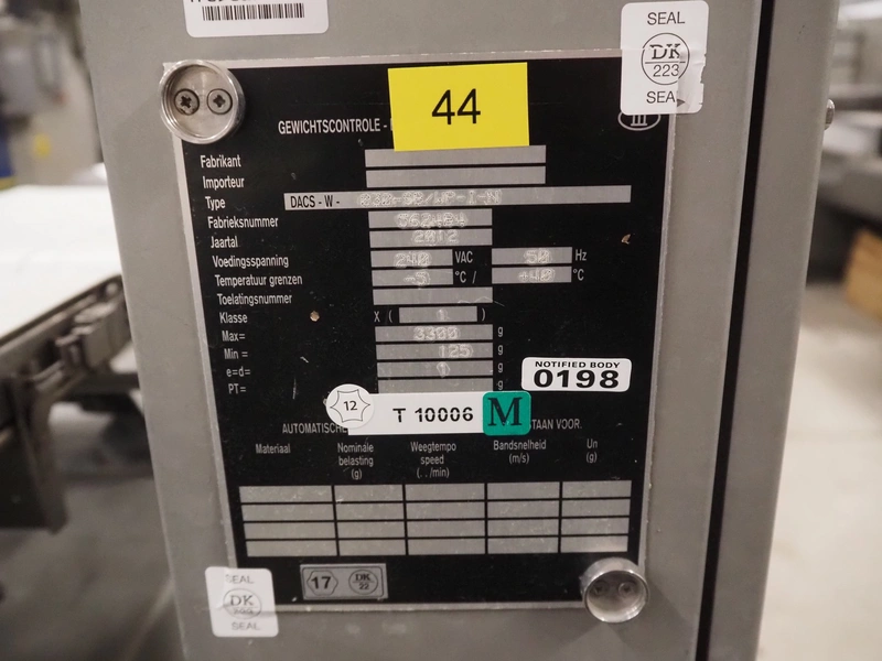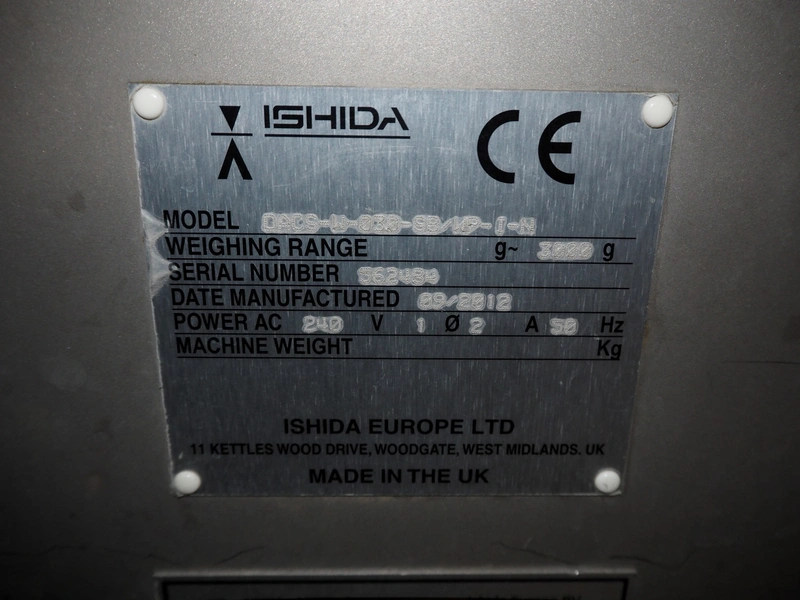 Ishida checkweigher with rejecter, type: DACS-W-030-SB/WP-I-N, serial number: 562484, year of construction: 2012, 240 V, 50 Hz, 2A, maximum weight: 3300 mm, minimum weight: 125 gram, plastic belt, belt width: 300 mm, total dimensions: 1800 mm x 810 mm x 1600 mm.