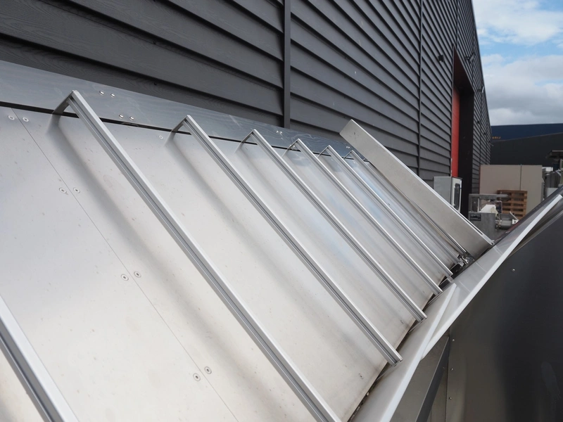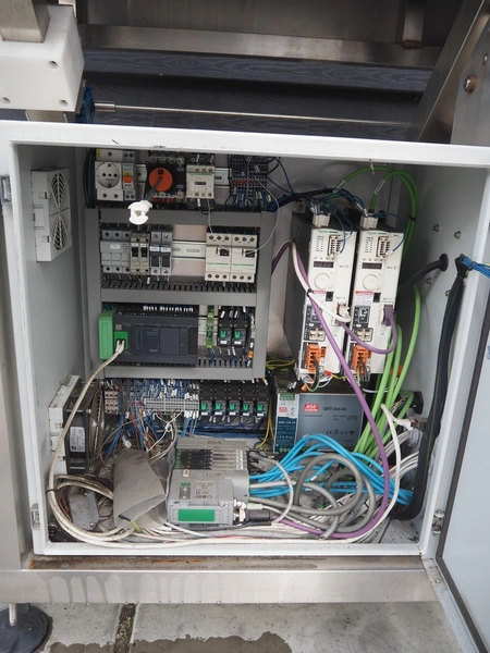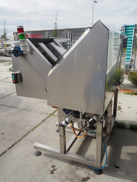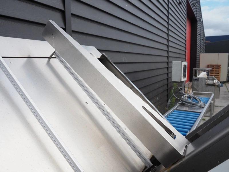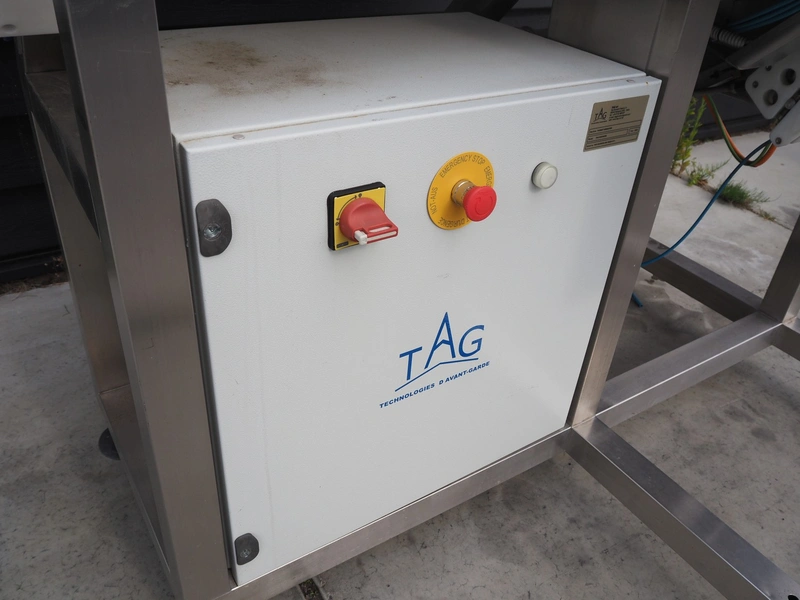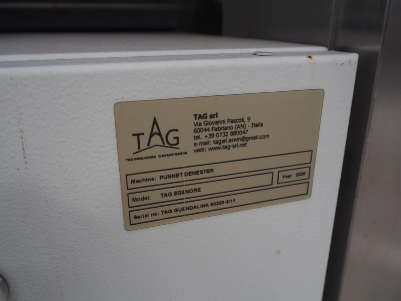 TAG punnet denester, model: TAG Egenore, serial number: TAG Guendalina 00220-3/11, year of construction: 2020, chain belt with dividers, belt width: 550 mm, distance between dividers: 250 mm, divider height: 40 mm, total dimensions: 2200 mm x 1400 mm x 1750 mm.