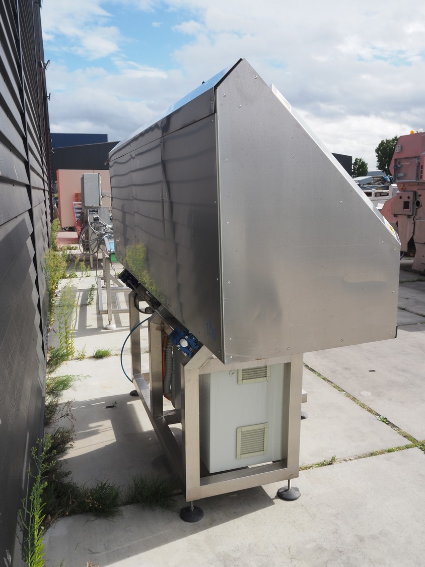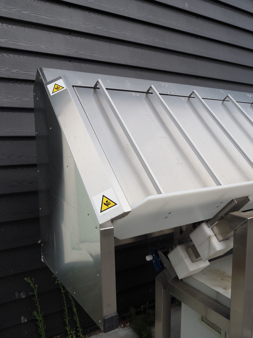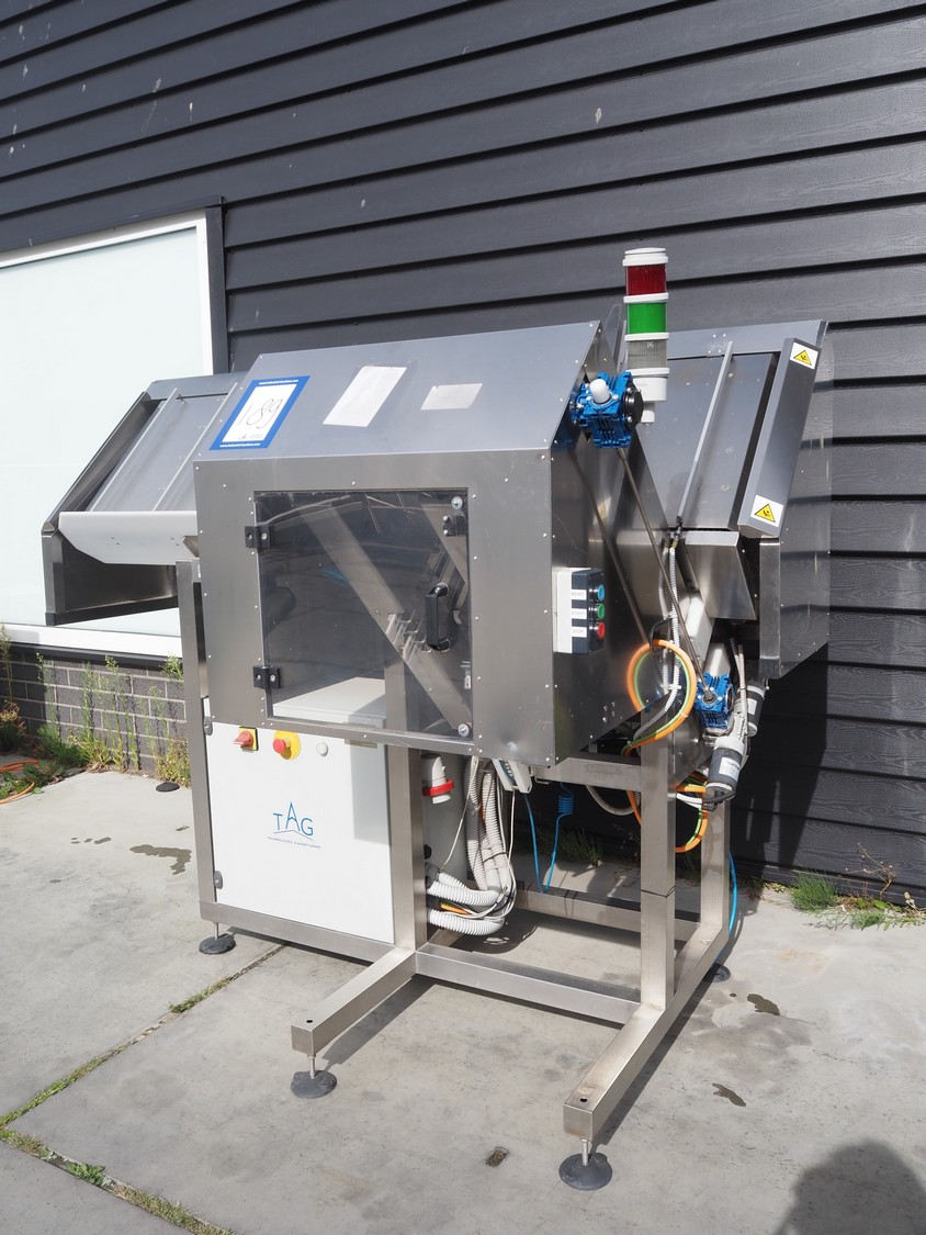 TAG punnet denester, model: TAG Egenore, serial number: TAG Guendalina 00220-3/11, year of construction: 2020, chain belt with dividers, belt width: 550 mm, distance between dividers: 250 mm, divider height: 40 mm, total dimensions: 2200 mm x 1400 mm x 1750 mm.
