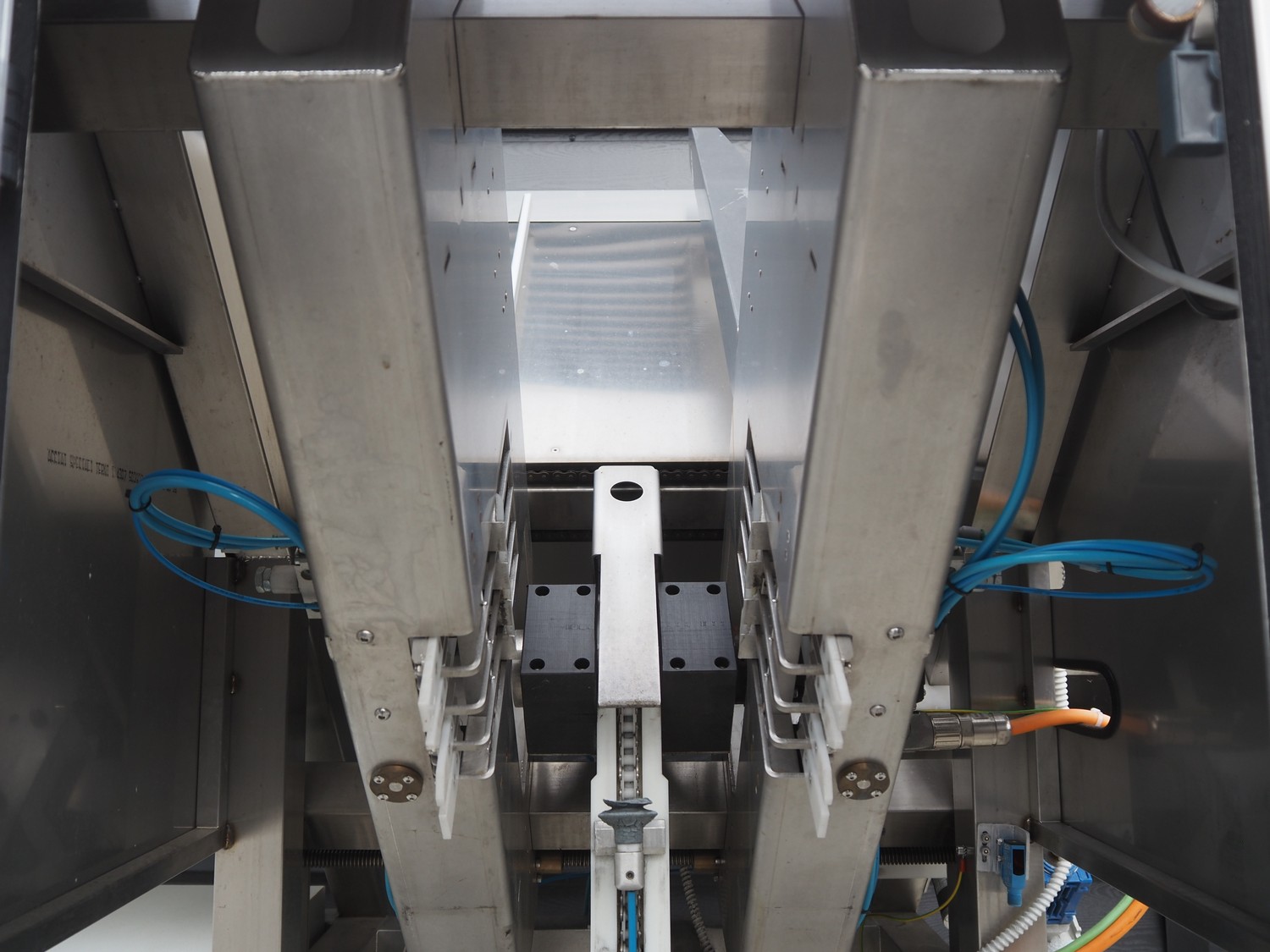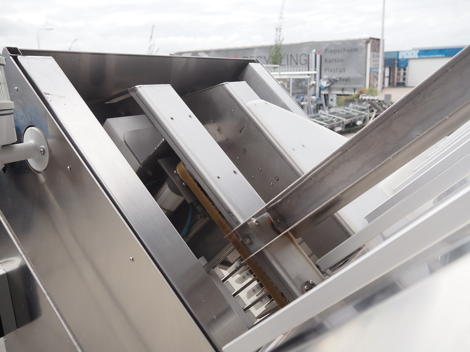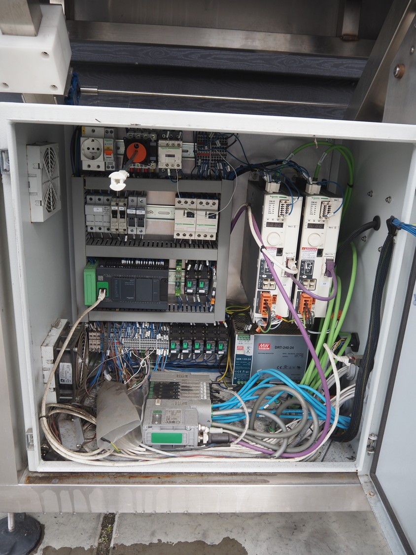 TAG punnet denester, model: TAG Egenore, serial number: TAG Guendalina 00220-3/11, year of construction: 2020, chain belt with dividers, belt width: 550 mm, distance between dividers: 250 mm, divider height: 40 mm, total dimensions: 2200 mm x 1400 mm x 1750 mm.