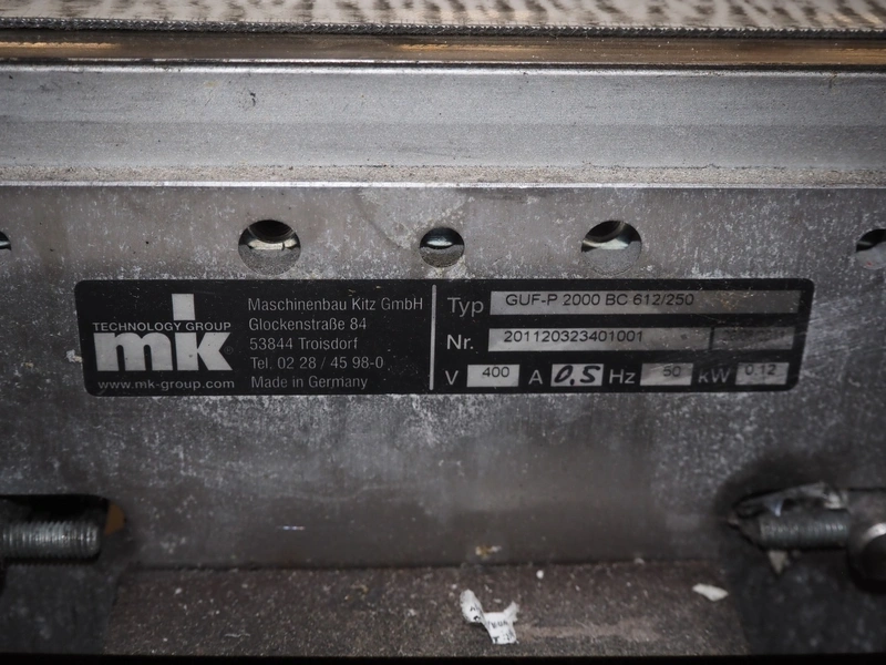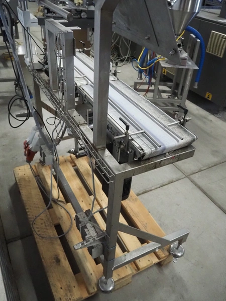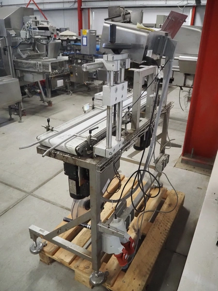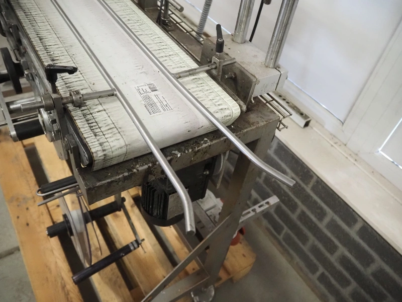 EME labelling machine, type: EME Serie 1000, serial number: SEE Label head, 220-240 VAC, 50/60 Hz, 250 W, belt width: 235 mm, total dimensions: 2200 mm x 750 mm x 1550 mm.