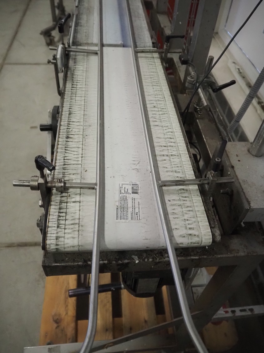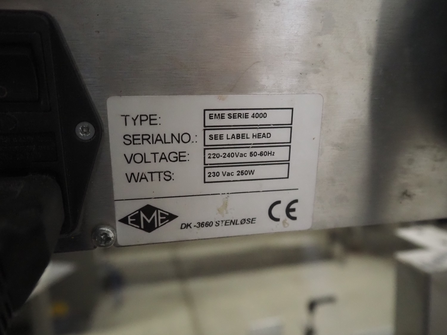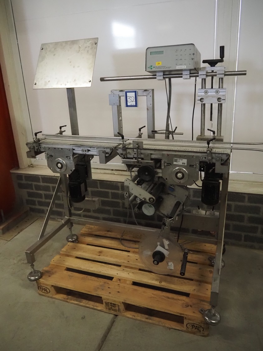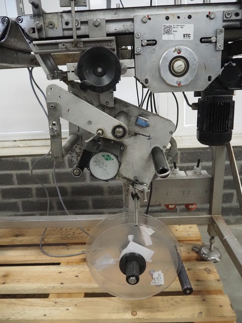 EME labelling machine, type: EME Serie 1000, serial number: SEE Label head, 220-240 VAC, 50/60 Hz, 250 W, belt width: 235 mm, total dimensions: 2200 mm x 750 mm x 1550 mm.
