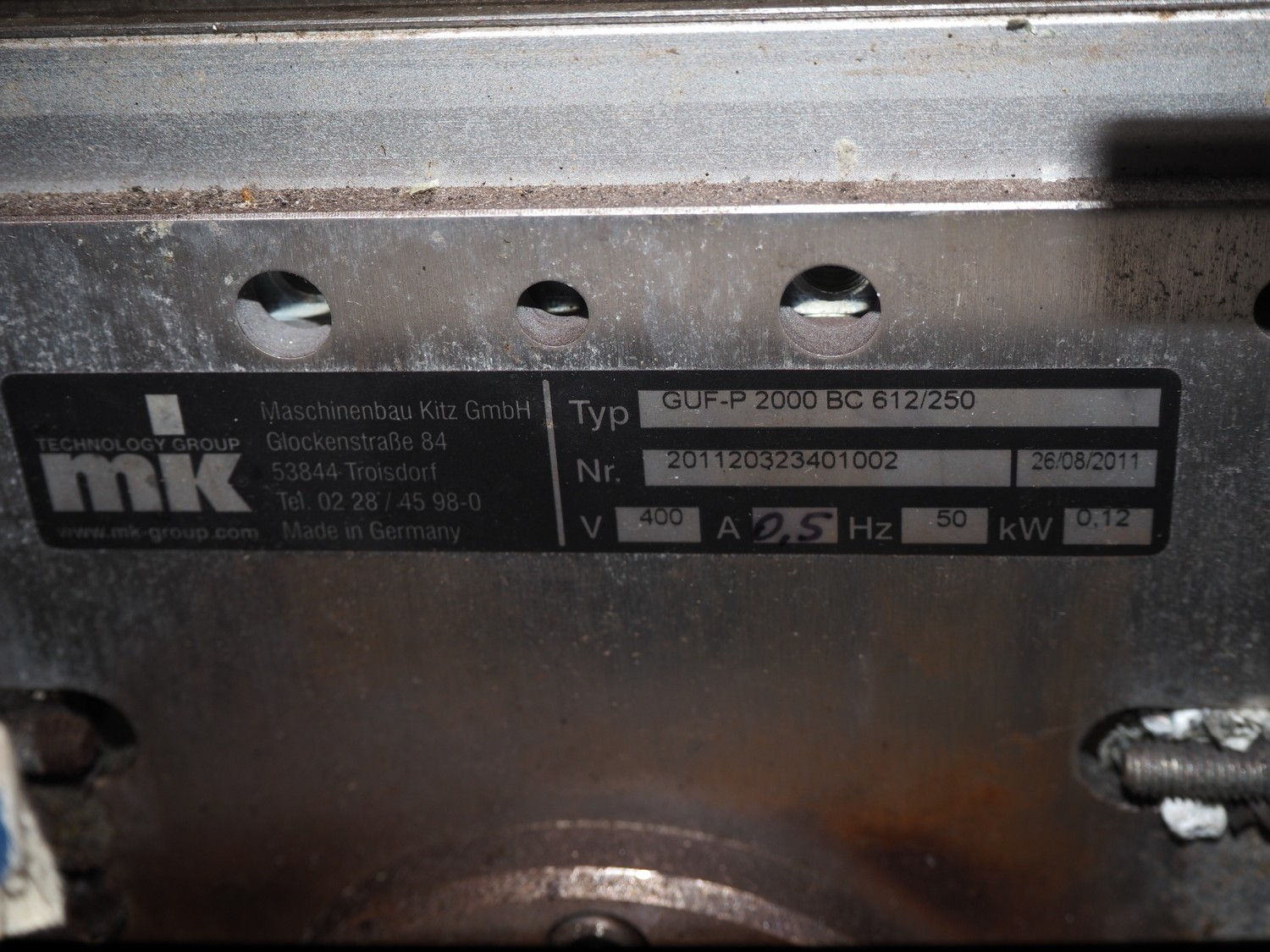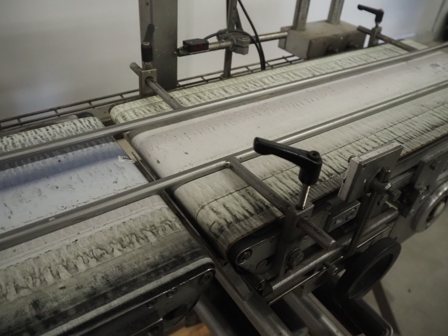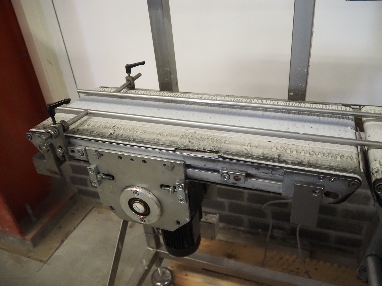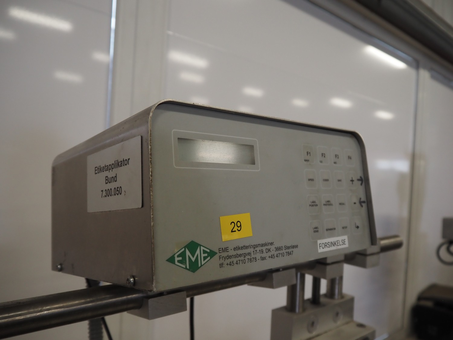 EME labelling machine, type: EME Serie 1000, serial number: SEE Label head, 220-240 VAC, 50/60 Hz, 250 W, belt width: 235 mm, total dimensions: 2200 mm x 750 mm x 1550 mm.