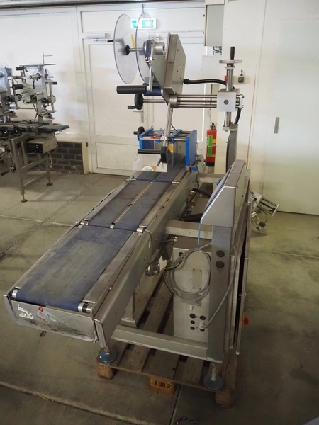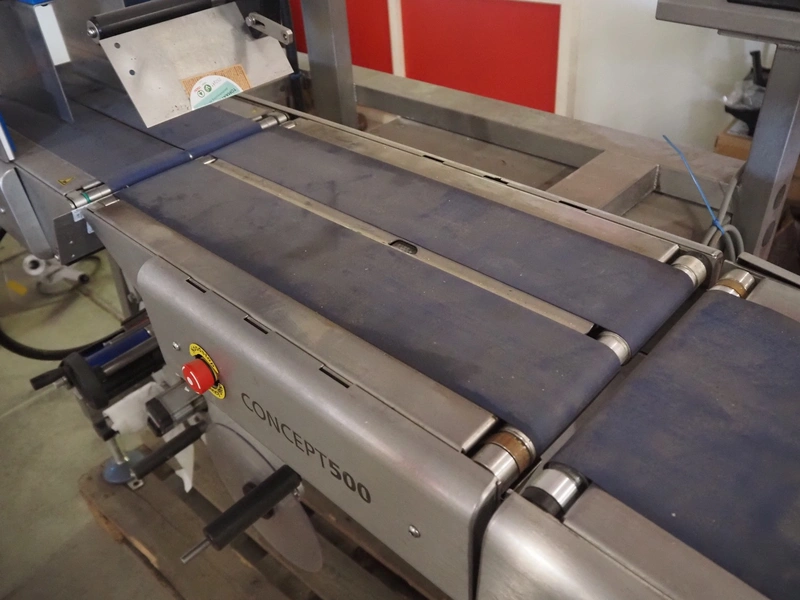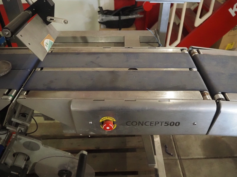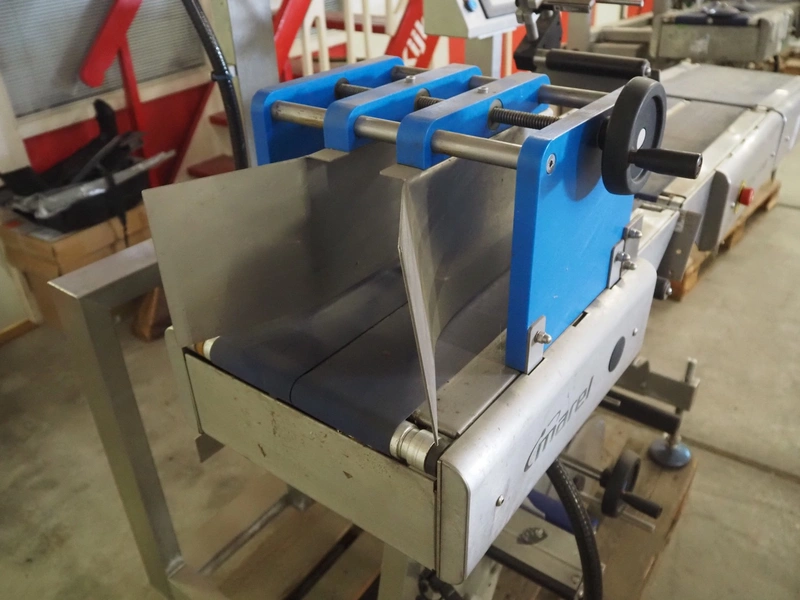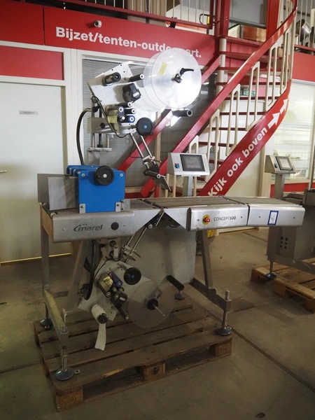 Marel labelling machine, model: CONCEPT 500, serial number: 10427440, year of construction: 2019, 230 V, 50/60 Hz, 4 A, 1 kW, plastic belt, belt width: (2x) 110 mm, total dimensions: 1700 mm x 750 mm x 1950 mm.