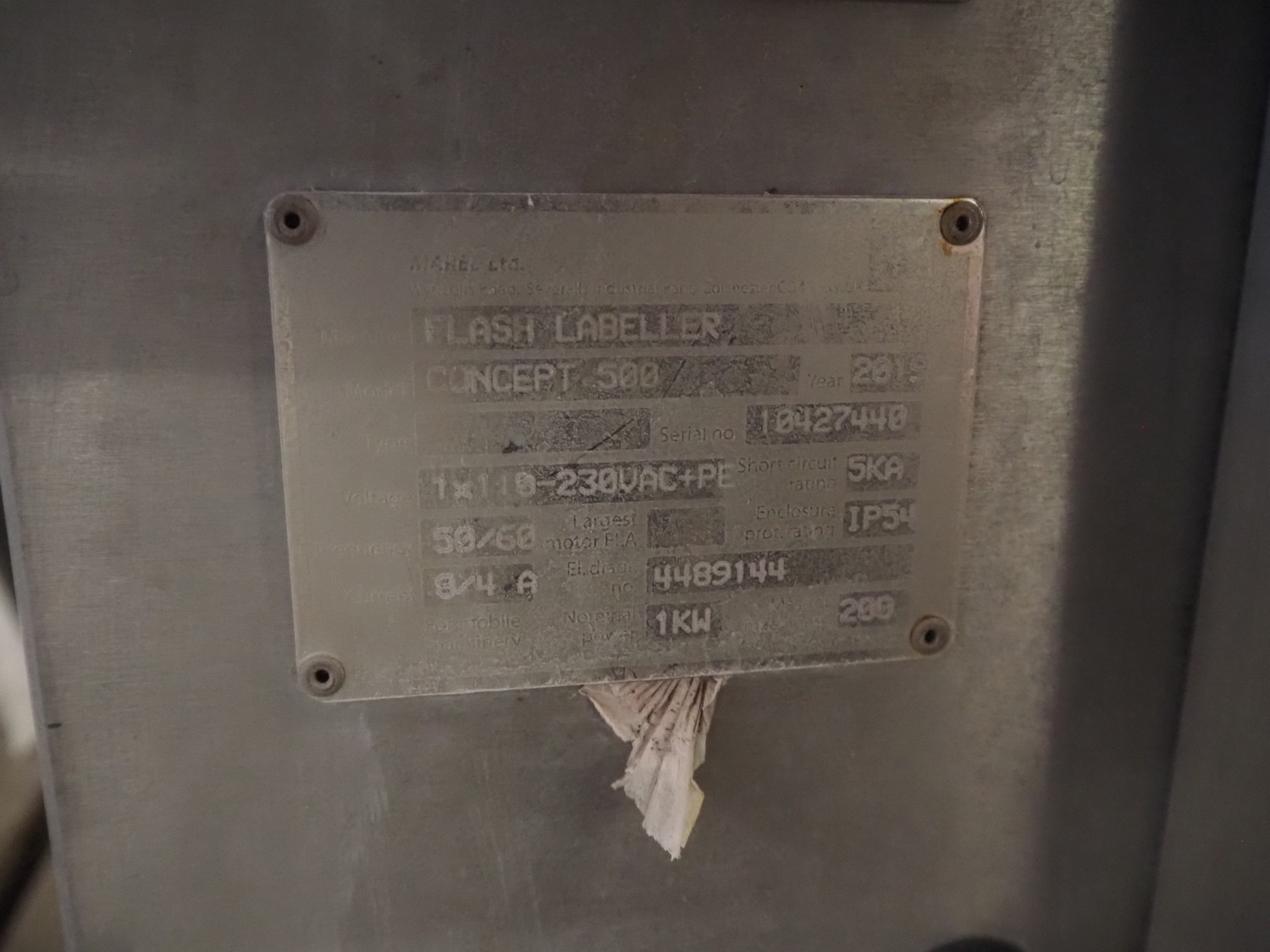 Marel labelling machine, model: CONCEPT 500, serial number: 10427440, year of construction: 2019, 230 V, 50/60 Hz, 4 A, 1 kW, plastic belt, belt width: (2x) 110 mm, total dimensions: 1700 mm x 750 mm x 1950 mm.