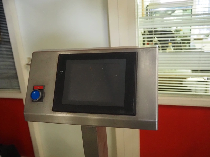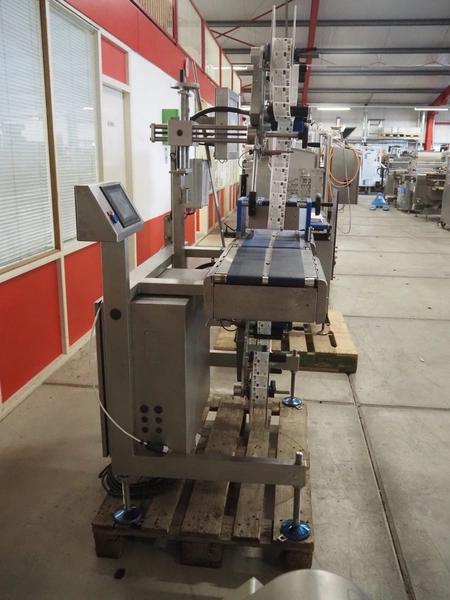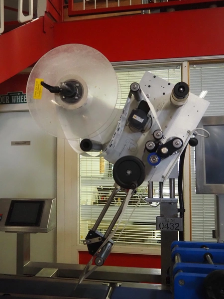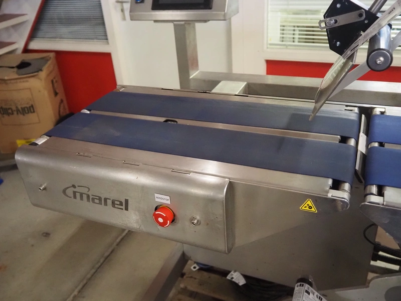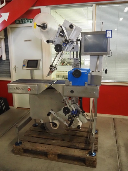 Marel labelling machine with top and bottom labeller, model: CONCEPT 500, serial number: LA0697, year of construction: 2016, 230 V, 50/60 Hz, 4 A, 1 kW, weight: 160 kg, plastic belt, belt width: (2x) 110 mm, total dimensions: 1400 mm x 780 mm x 1830 mm.