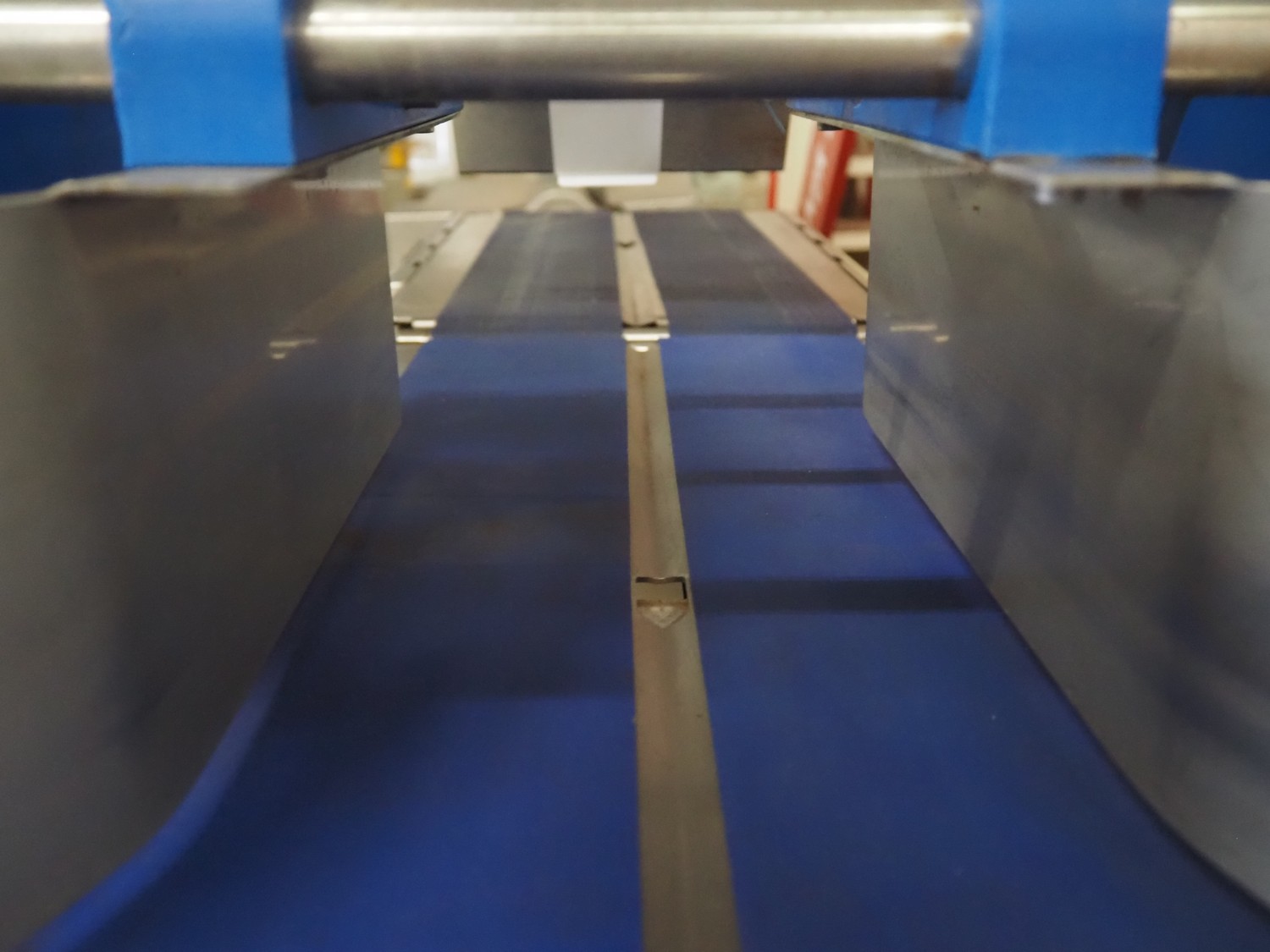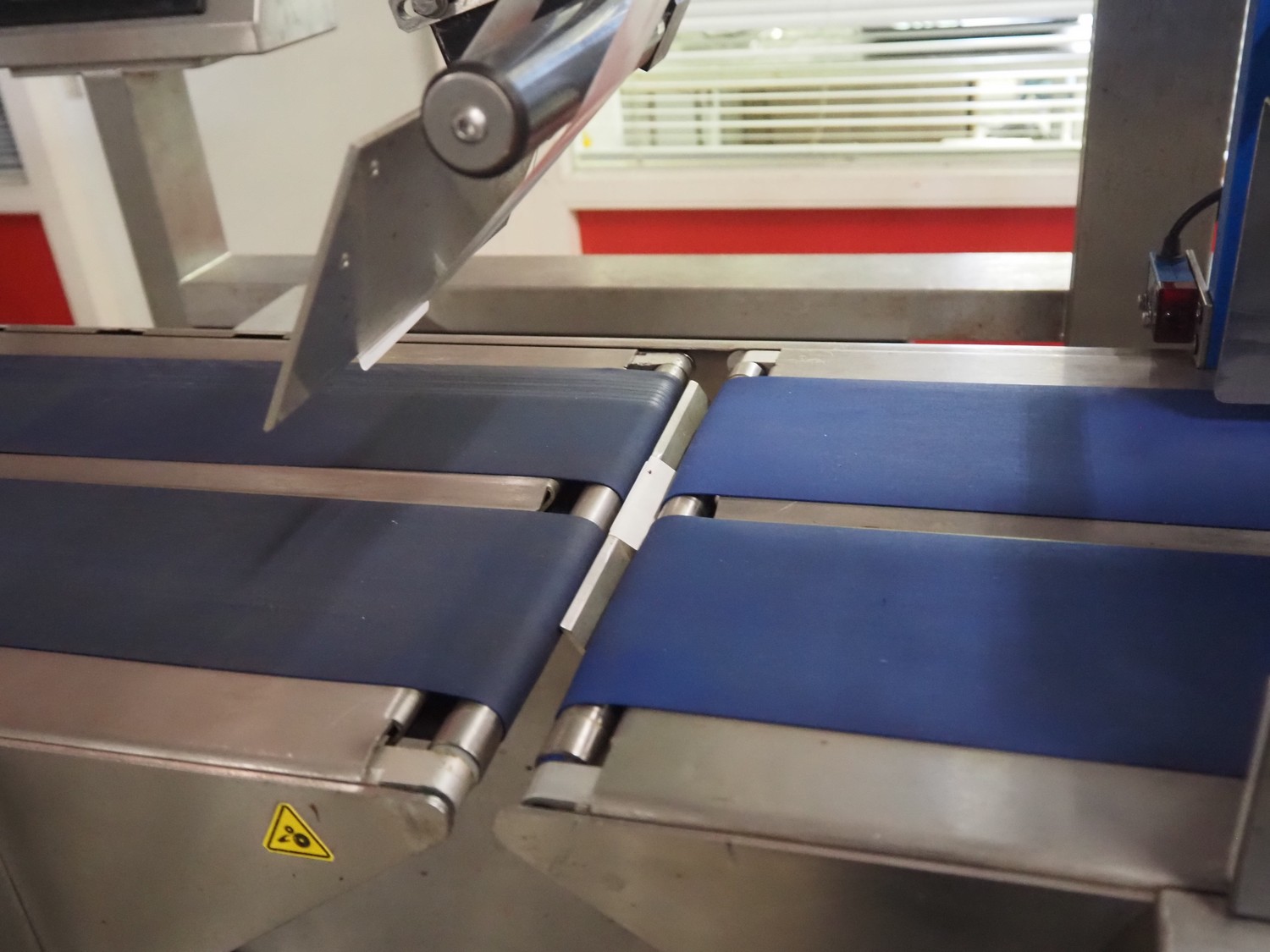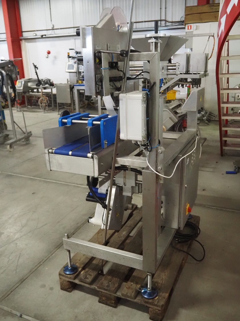 Marel labelling machine with top and bottom labeller, model: CONCEPT 500, serial number: LA0697, year of construction: 2016, 230 V, 50/60 Hz, 4 A, 1 kW, weight: 160 kg, plastic belt, belt width: (2x) 110 mm, total dimensions: 1400 mm x 780 mm x 1830 mm.