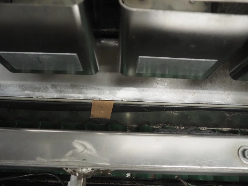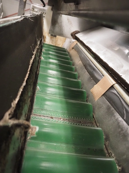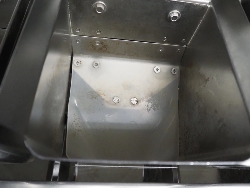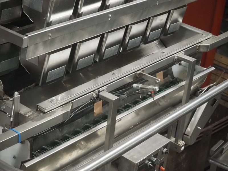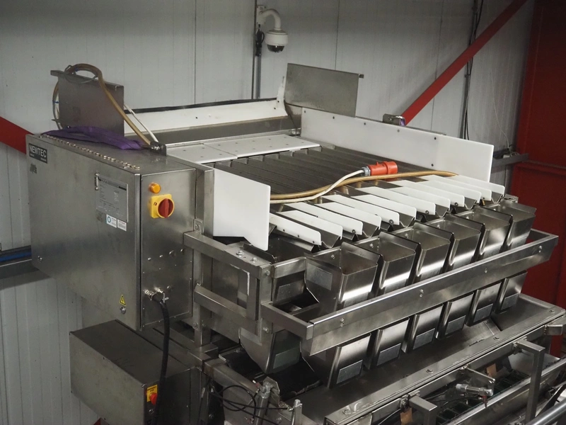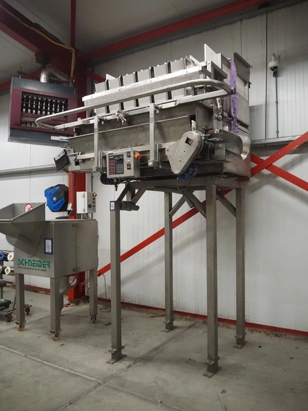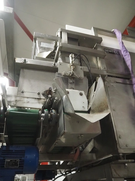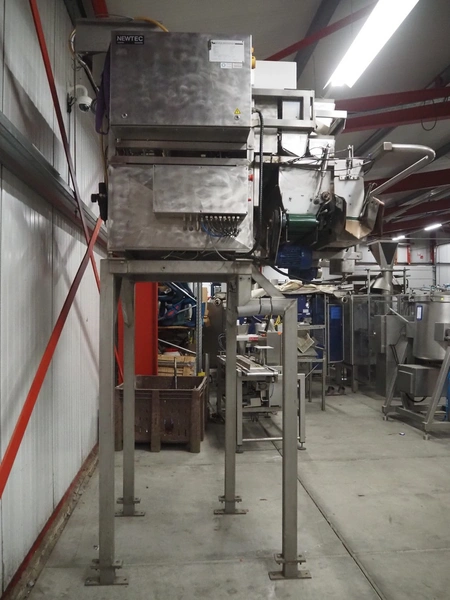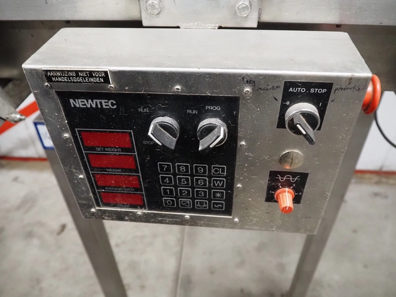 Newtec linear weigher on s/s platform, type: 2013M, number: 6404, year of construction: 2002, 400 V, 3 Ph, 50 Hz, 9 A, 1.4 kW, 6 lanes, lane width: 85 mm, total dimensions: 1900 mm x 2000 mm x 3320 mm.