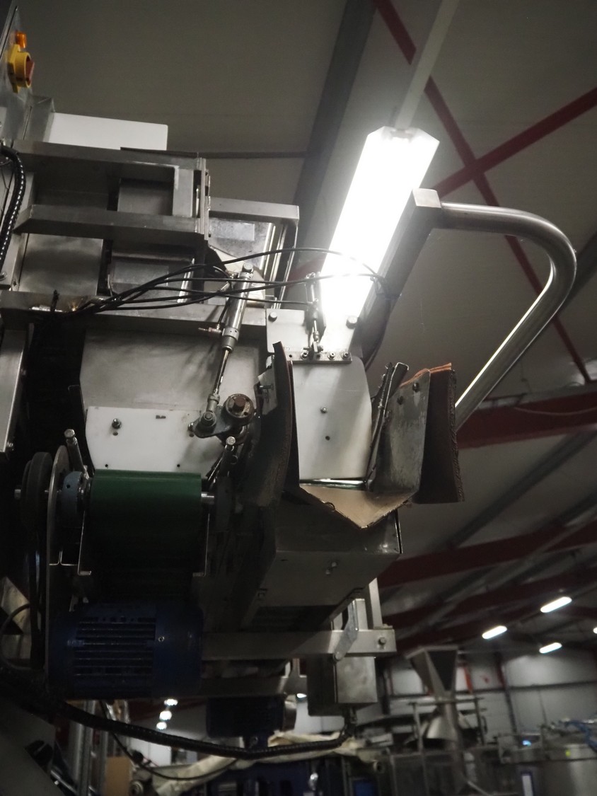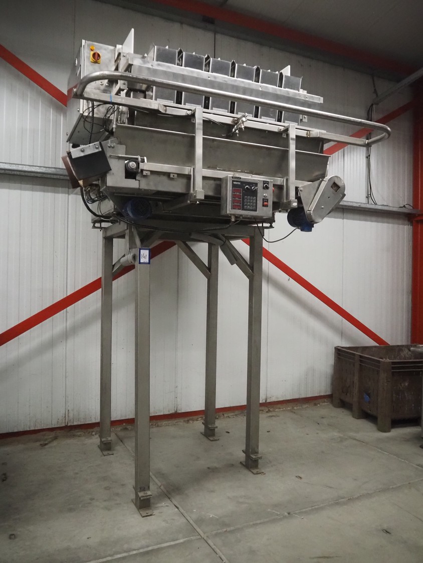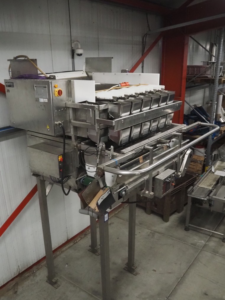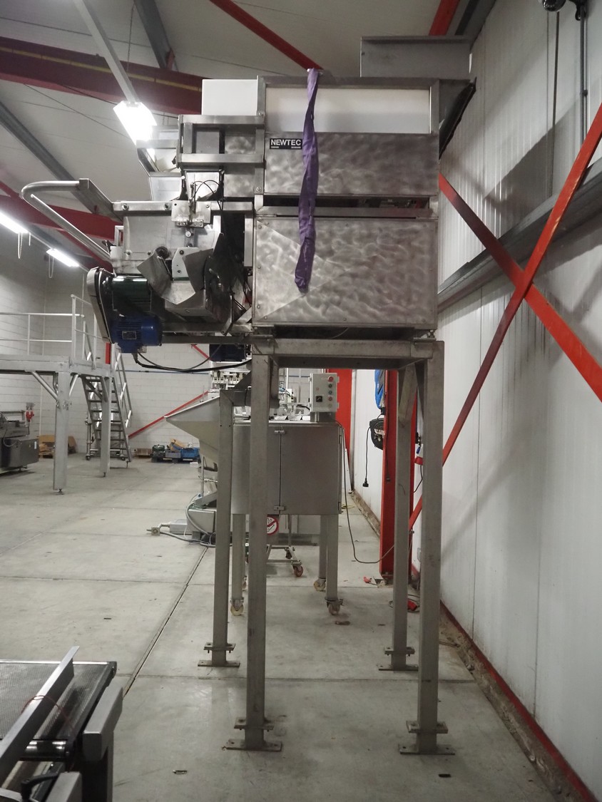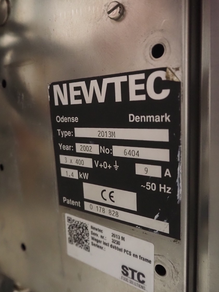Newtec linear weigher on s/s platform, type: 2013M, number: 6404, year of construction: 2002, 400 V, 3 Ph, 50 Hz, 9 A, 1.4 kW, 6 lanes, lane width: 85 mm, total dimensions: 1900 mm x 2000 mm x 3320 mm.