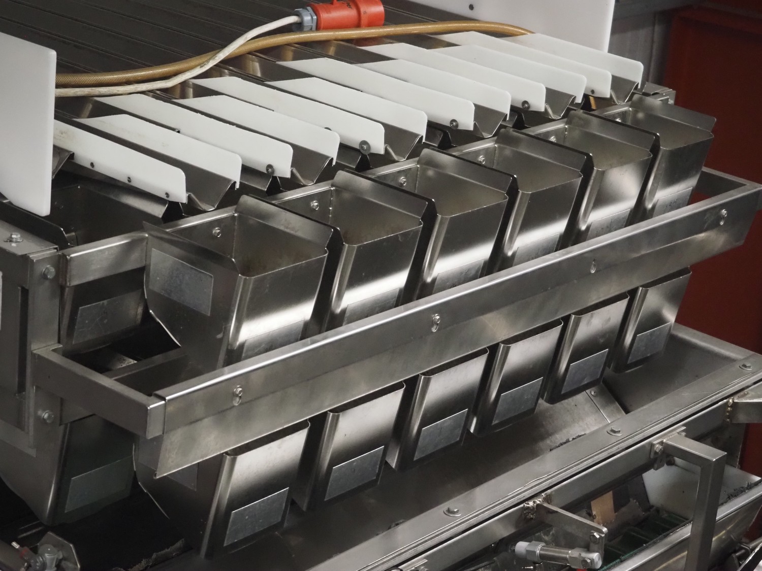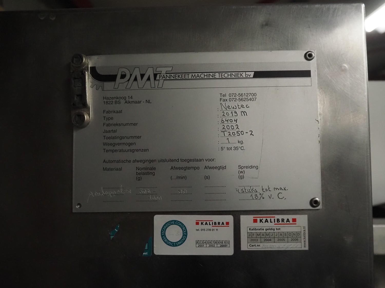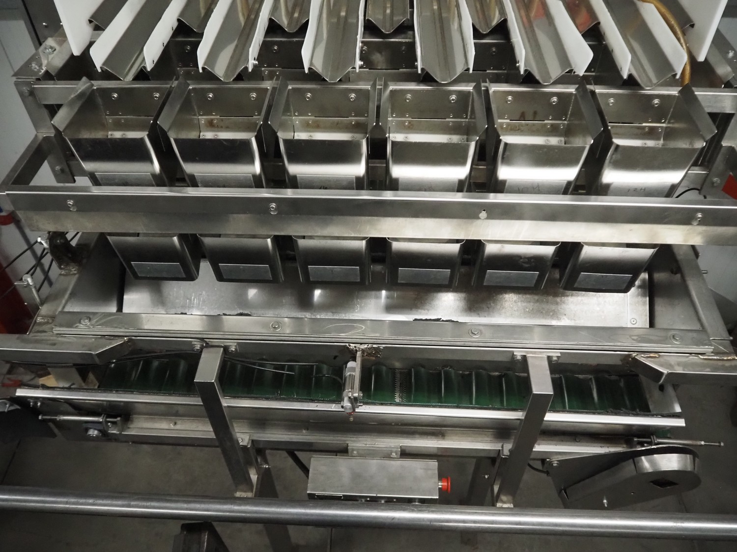 Newtec linear weigher on s/s platform, type: 2013M, number: 6404, year of construction: 2002, 400 V, 3 Ph, 50 Hz, 9 A, 1.4 kW, 6 lanes, lane width: 85 mm, total dimensions: 1900 mm x 2000 mm x 3320 mm.