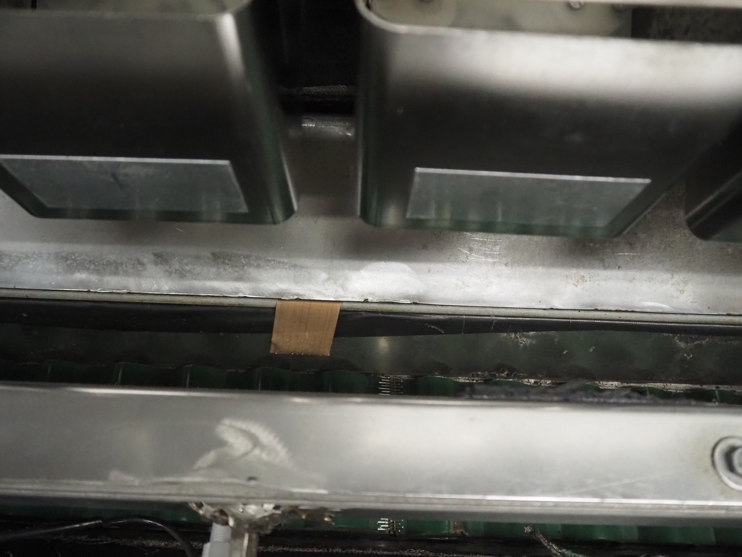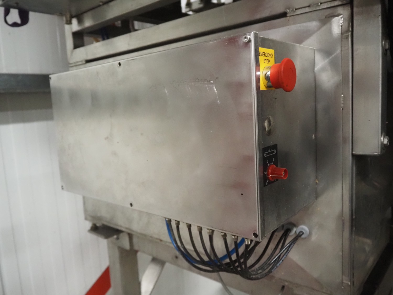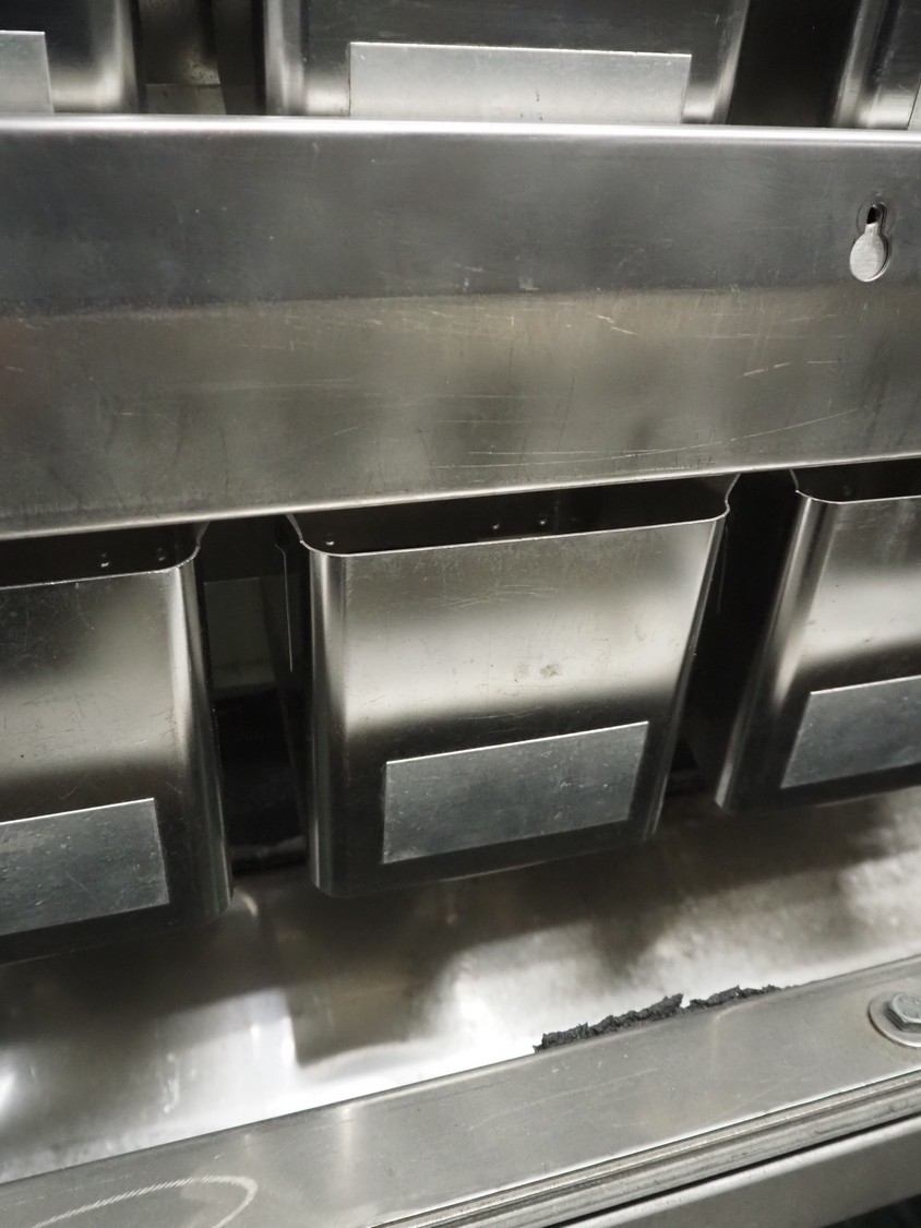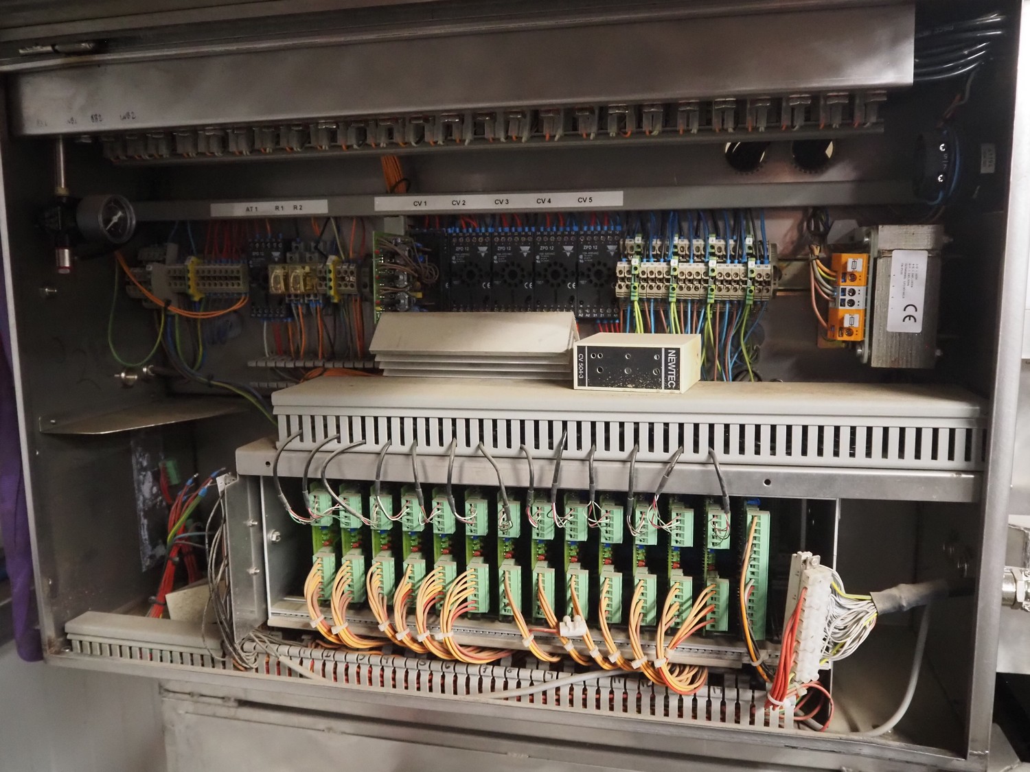 Newtec linear weigher on s/s platform, type: 2013M, number: 6404, year of construction: 2002, 400 V, 3 Ph, 50 Hz, 9 A, 1.4 kW, 6 lanes, lane width: 85 mm, total dimensions: 1900 mm x 2000 mm x 3320 mm.