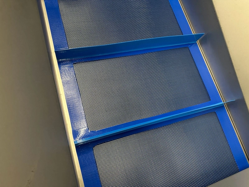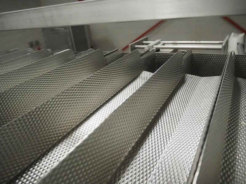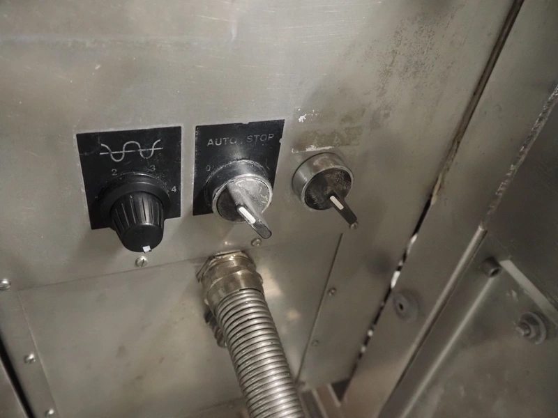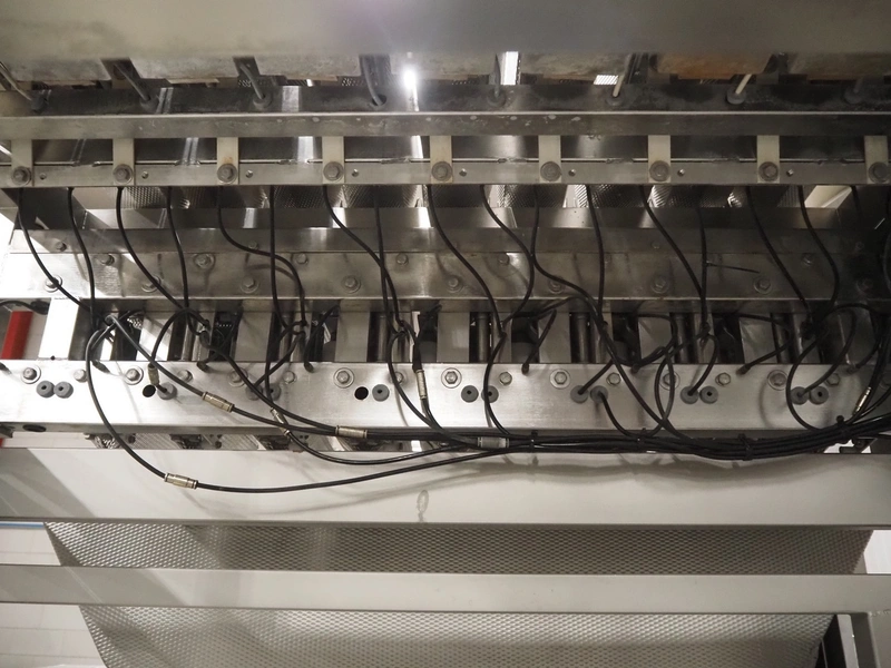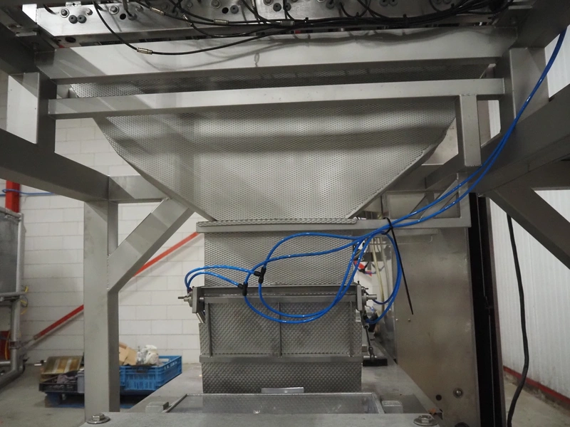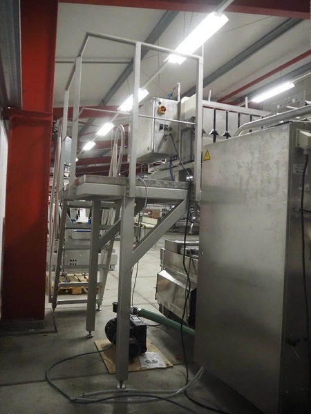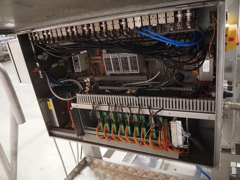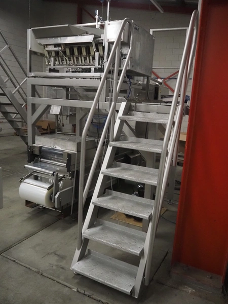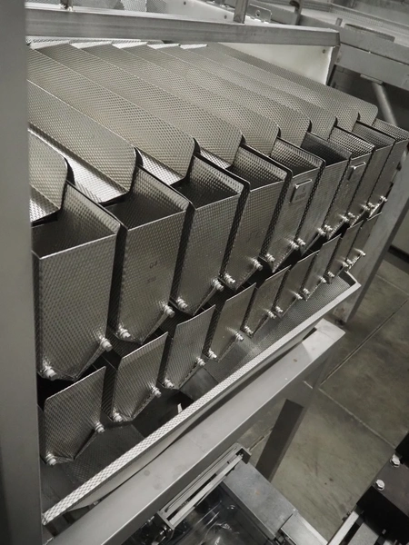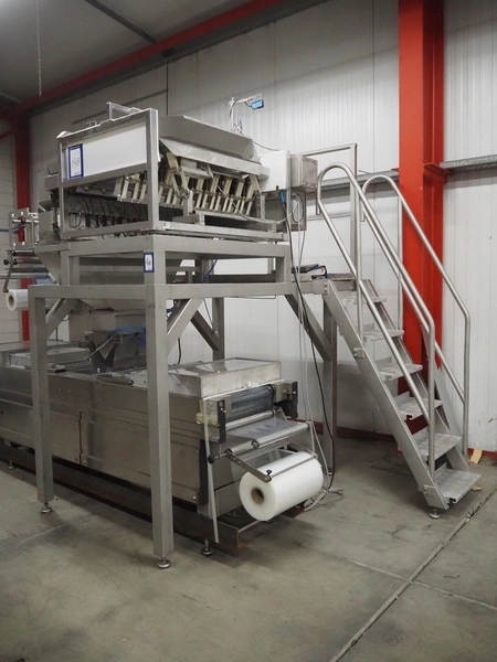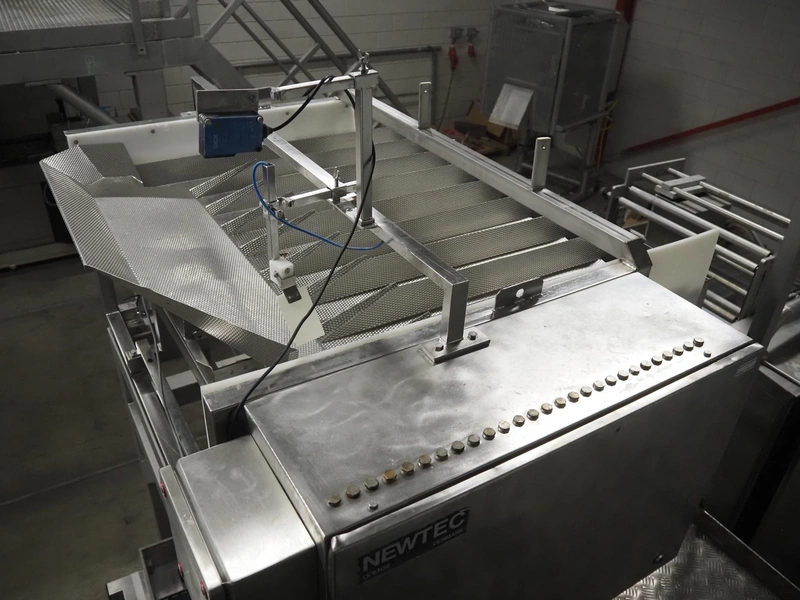 Newtec linear weigher on s/s platform, type: 2009PC, number: 4230, year of construction: 1998, 400 V, 3 Ph, 50 Hz, 5 A, 1 kW, 9 lanes, dimensions: 2350 mm x 2250 mm x 2500 mm. Including infeed elevating belt, s/s frame, plastic belt with dividers.