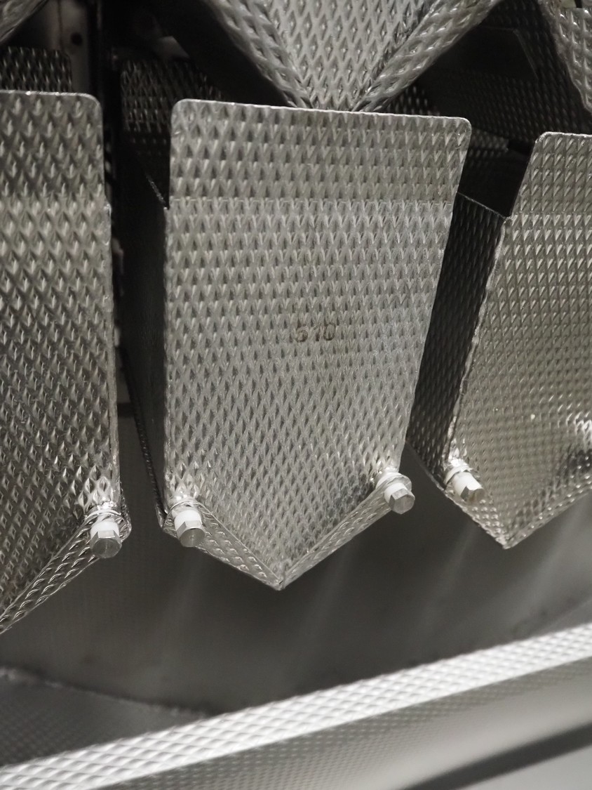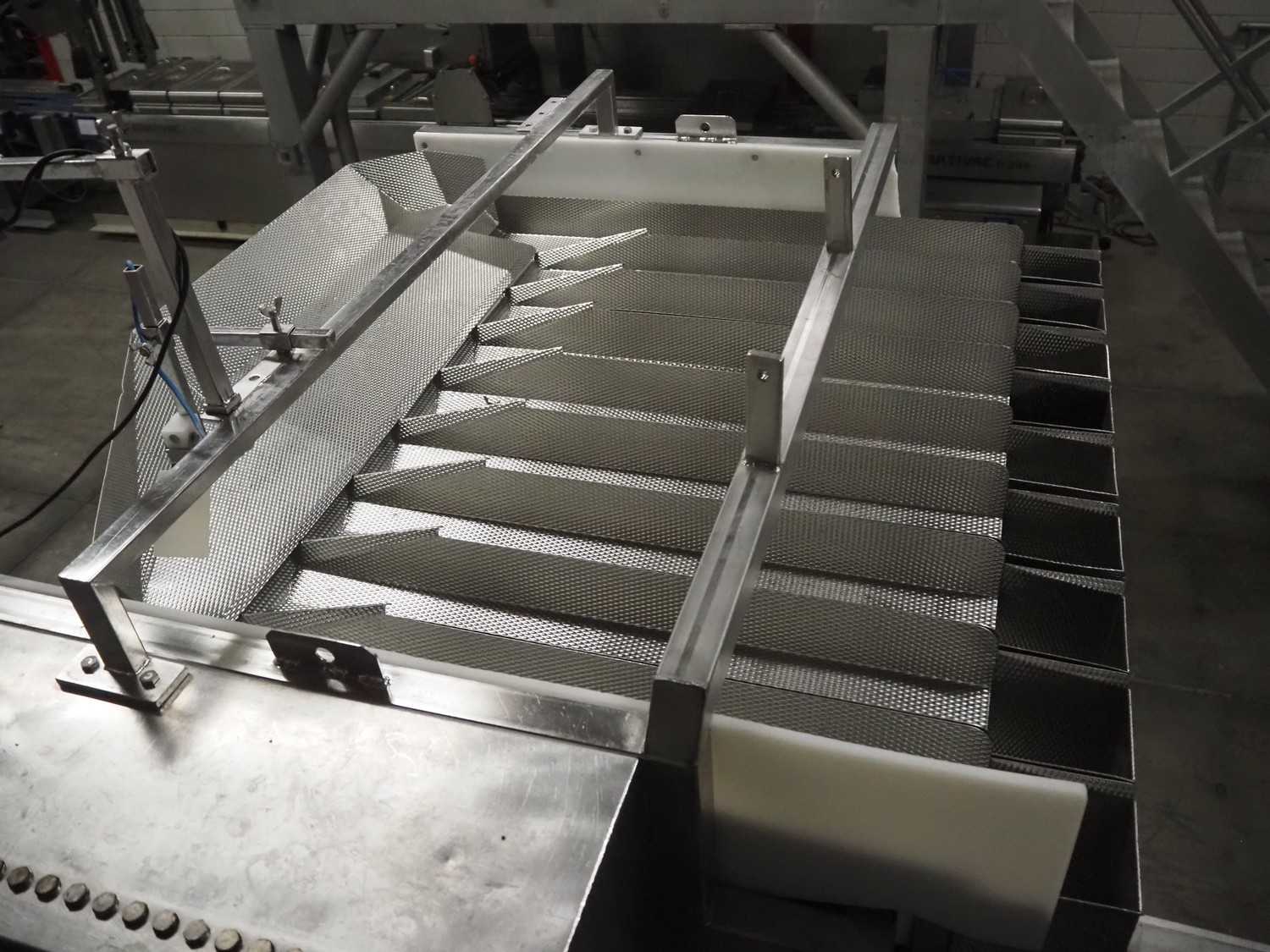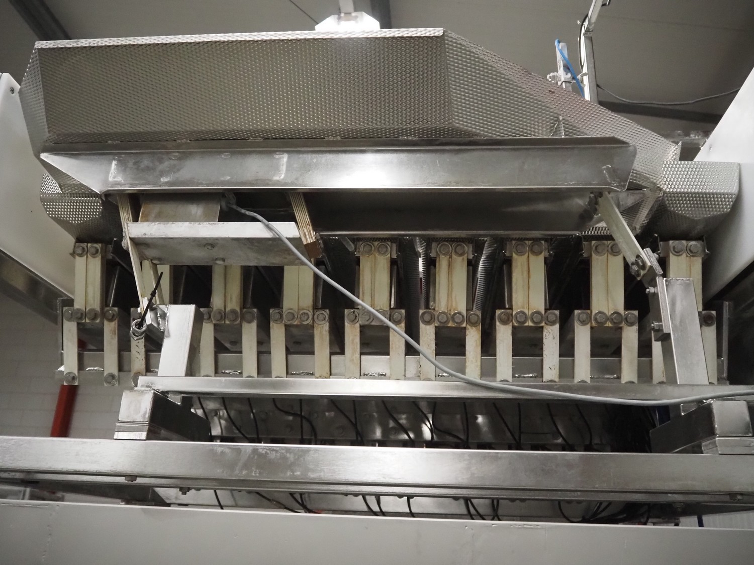 Newtec linear weigher on s/s platform, type: 2009PC, number: 4230, year of construction: 1998, 400 V, 3 Ph, 50 Hz, 5 A, 1 kW, 9 lanes, dimensions: 2350 mm x 2250 mm x 2500 mm. Including infeed elevating belt, s/s frame, plastic belt with dividers.