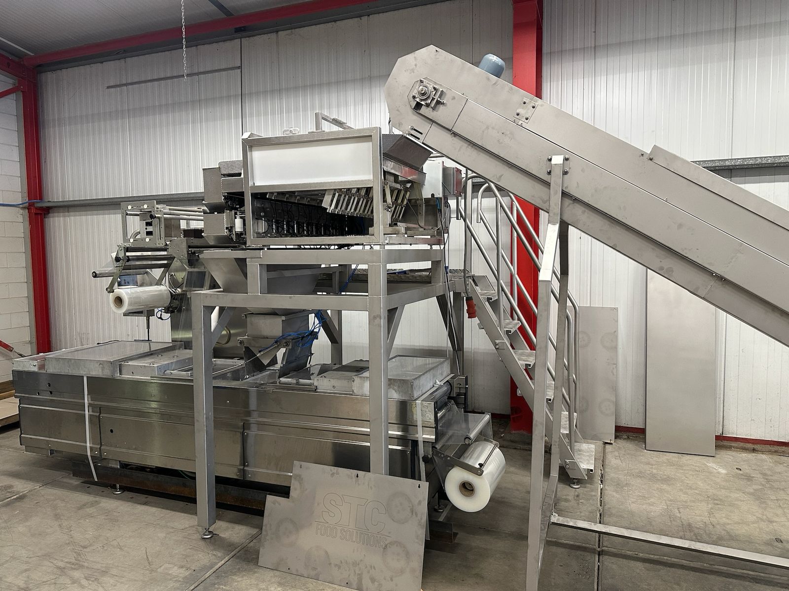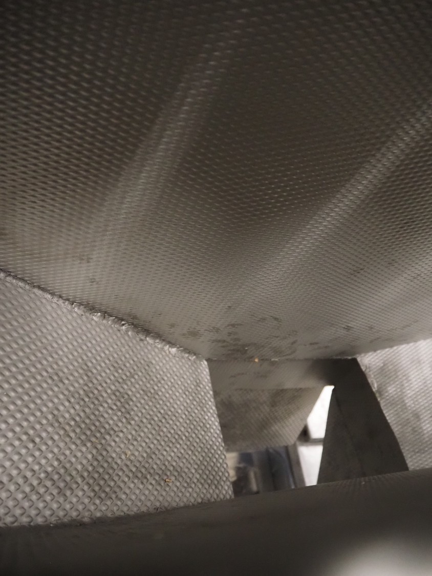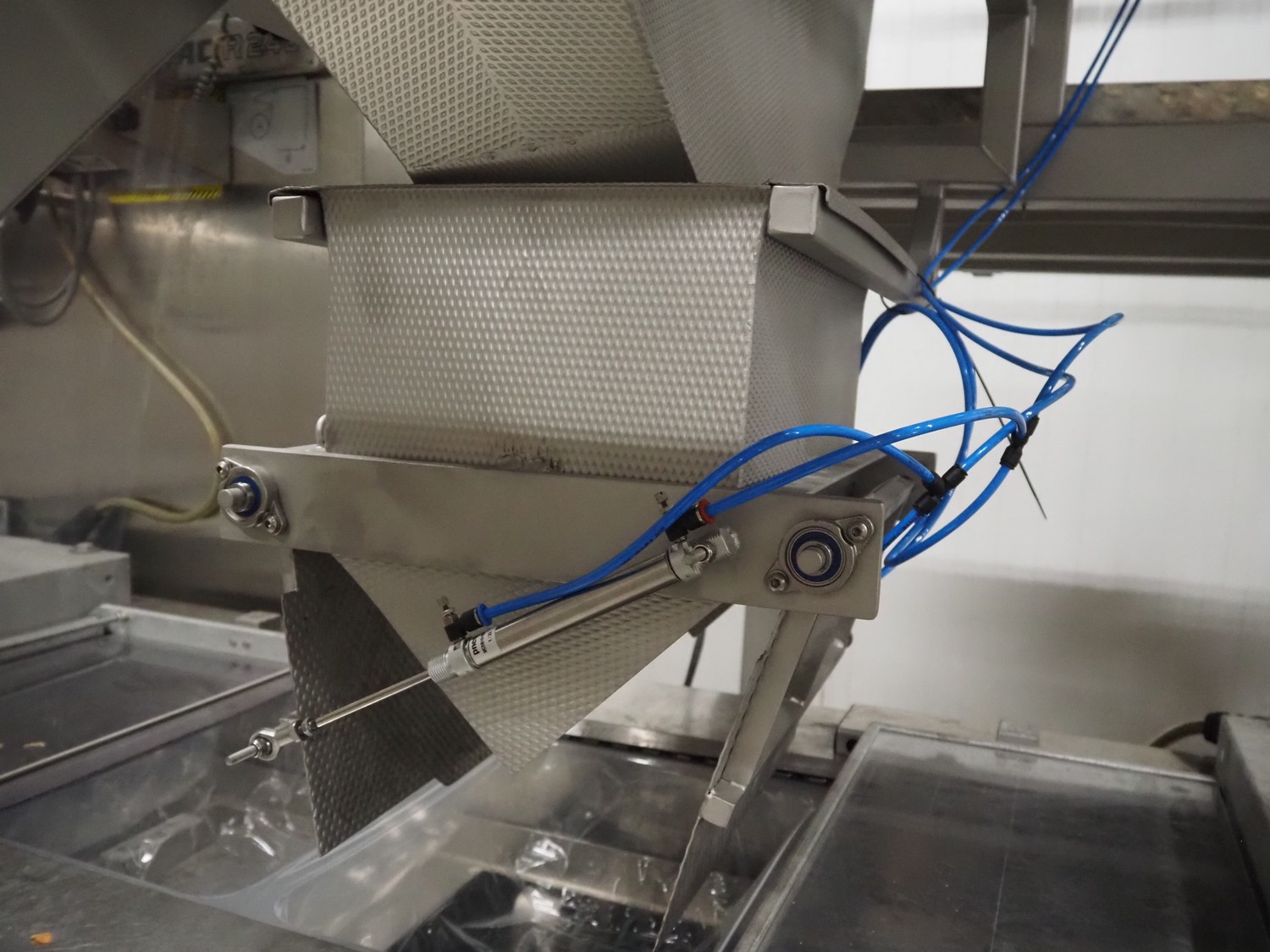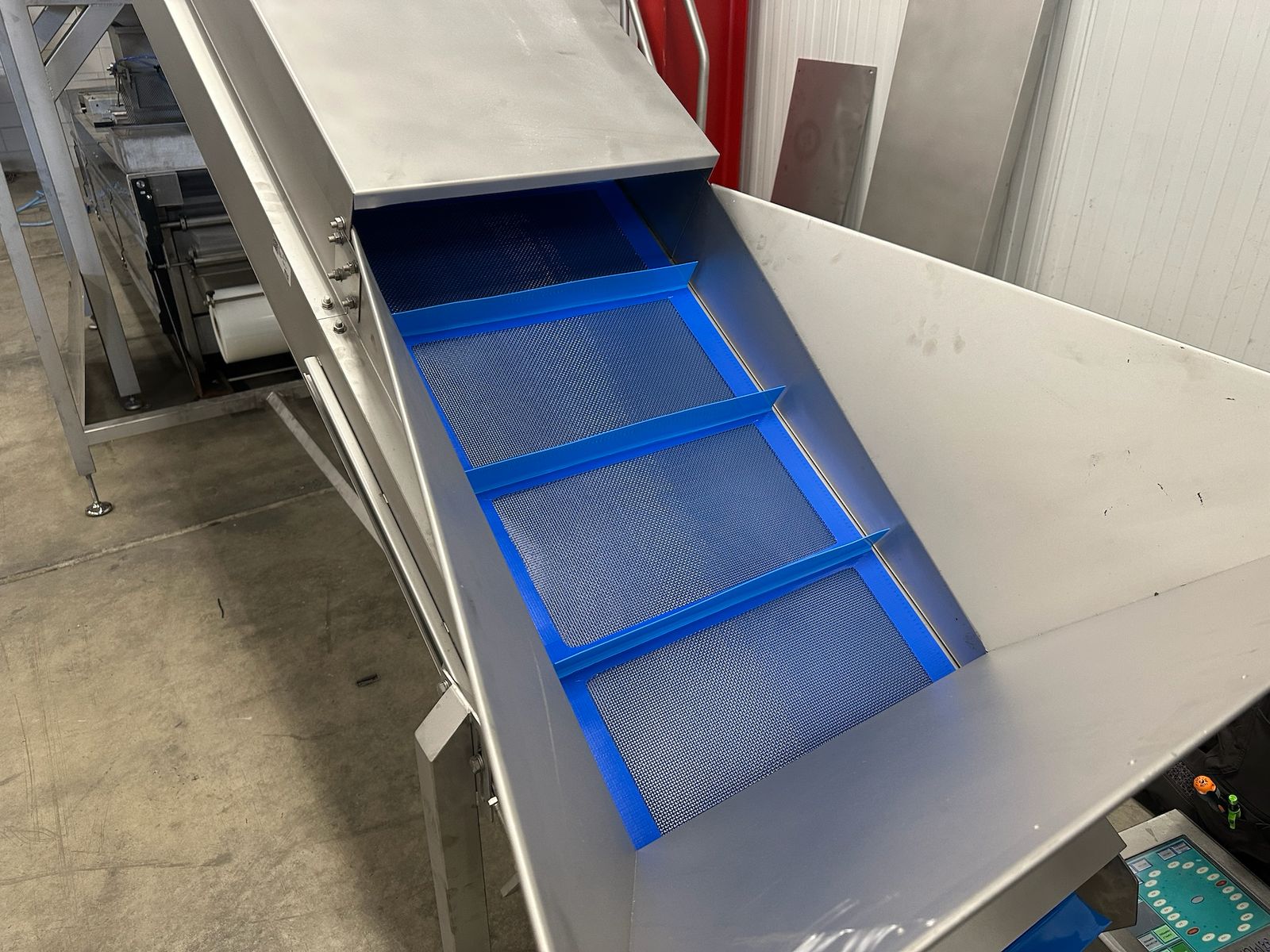 Newtec linear weigher on s/s platform, type: 2009PC, number: 4230, year of construction: 1998, 400 V, 3 Ph, 50 Hz, 5 A, 1 kW, 9 lanes, dimensions: 2350 mm x 2250 mm x 2500 mm. Including infeed elevating belt, s/s frame, plastic belt with dividers.