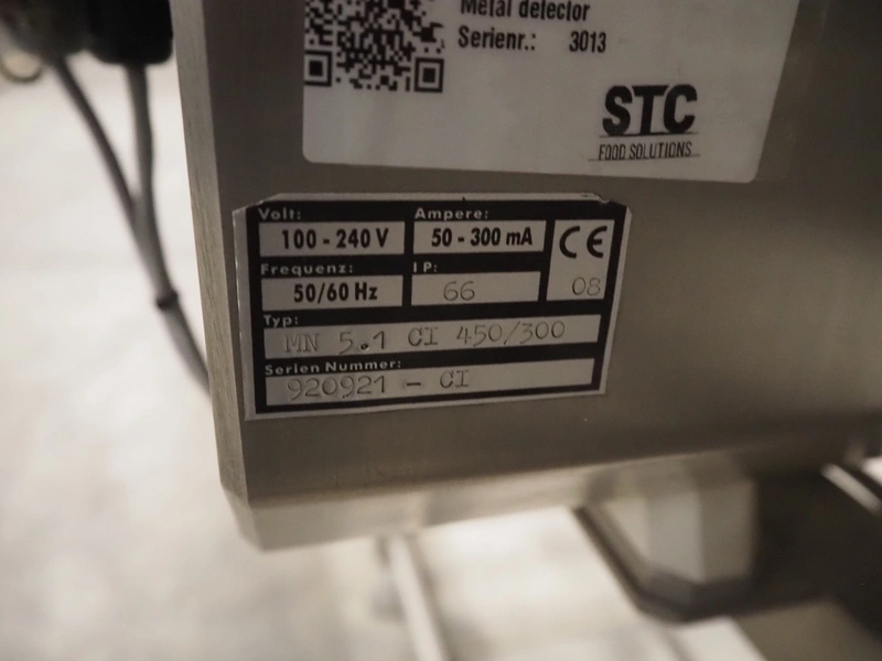 Zomerdam metal detector, type: MN 5.1 CI 450/300, serial number: 920921-CI, 240 V, 50/60 Hz, 2 A, 0.5 kW, plastic belt, belt width: 400 mm, clearance: 350 mm x 260 mm, total dimensions: 2650 mm x 950 mm x 1400 mm.