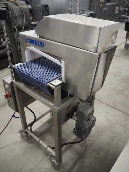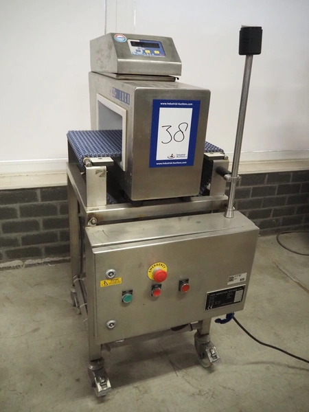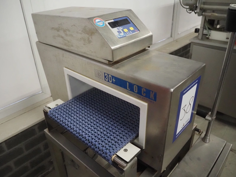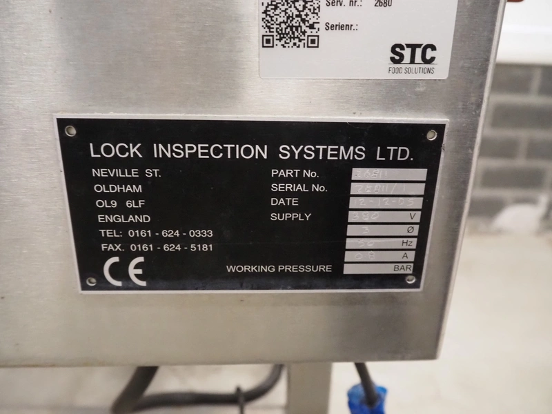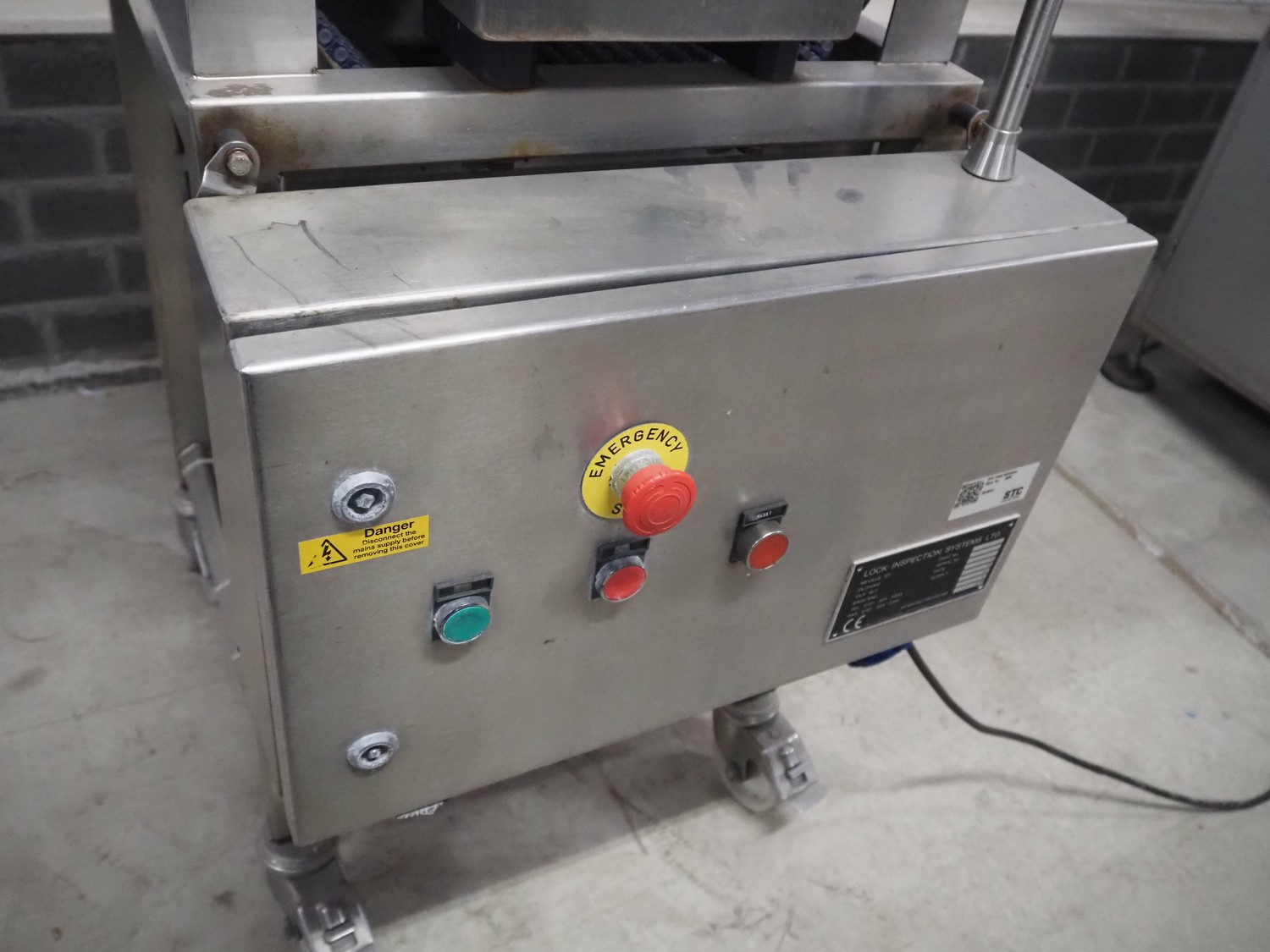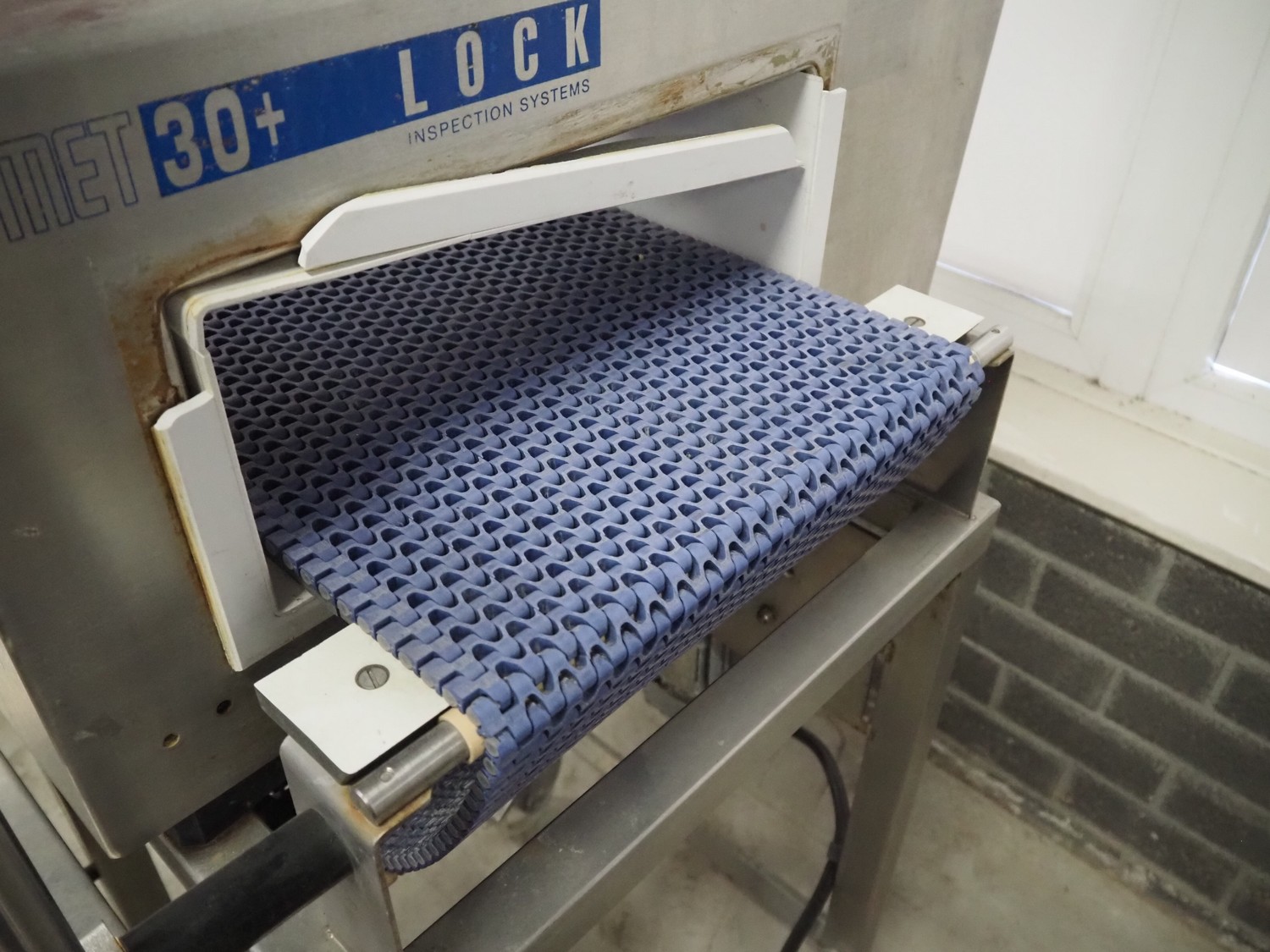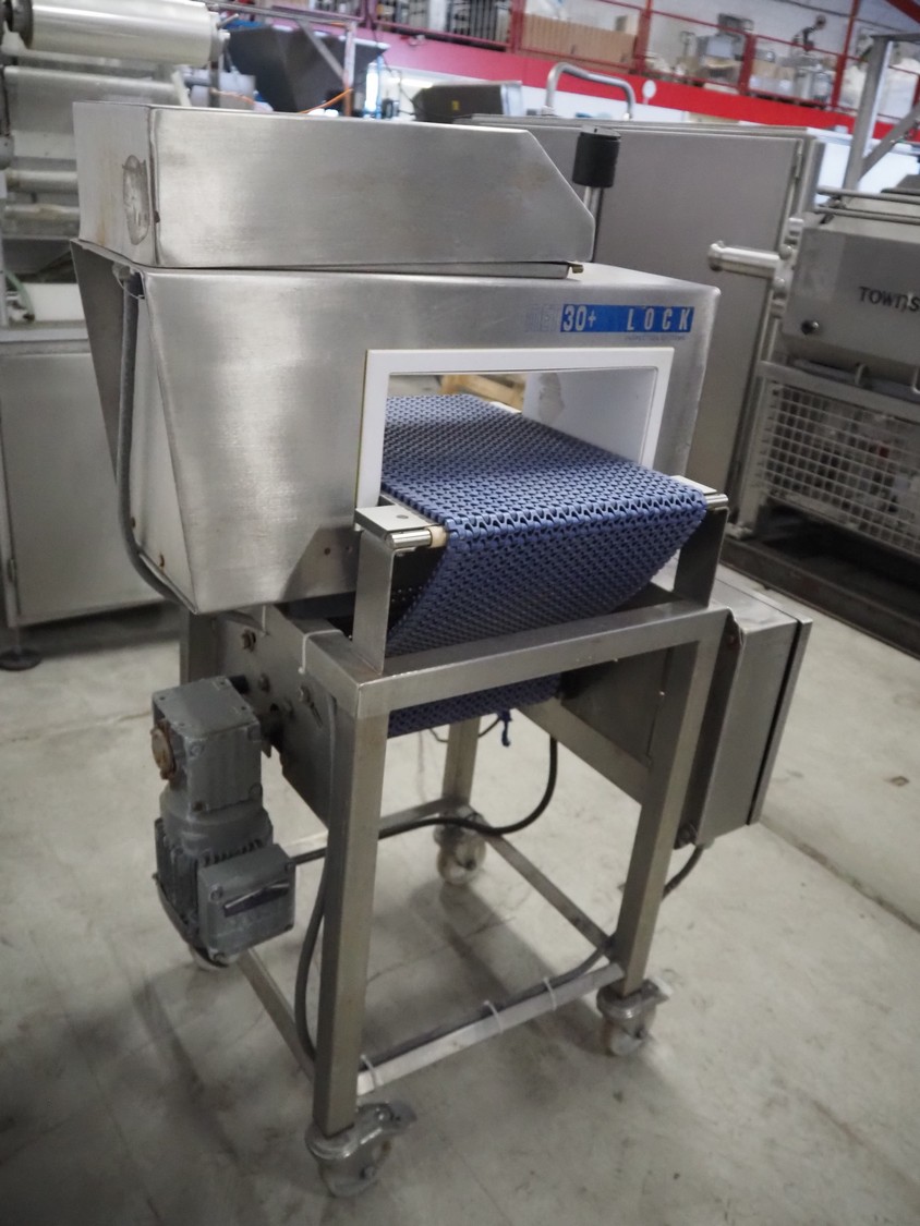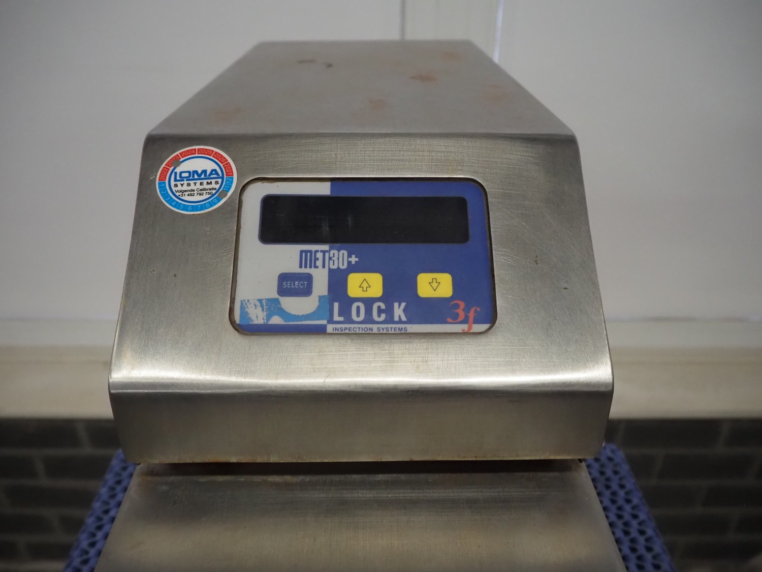 Lock Inspection Systems mobile metal detector, model: MET30+, serial number: 26811/1, year of construction: 12-12-05, 380 V, 3 Ph, 50 Hz, 0.8 A, plastic mesh belt, belt width: 350 mm, clearance: 370 mm x 120 mm, total dimensions: 870 mm x 500 mm x 1260 mm.