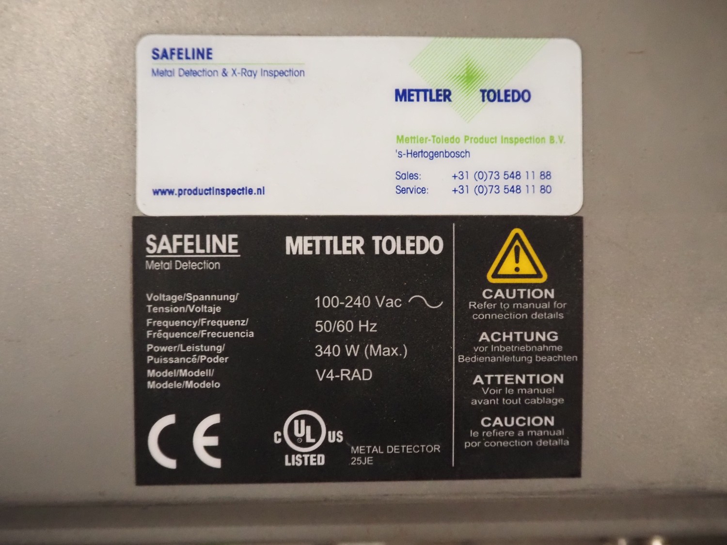 Mettler Toledo / Safeline metal detector head, type: R Series Profile, serial number: 891456, 100-240 V, 50-60 Hz, 340 W, clearance: 300 mm x 175 mm, total dimensions: 830 mm x 280 mm x 420 mm.