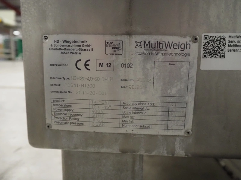 MultiWeigh 20-head multi head weigher, type: HDW20-4.0-60-TWIN, serial number: X0592, year of construction: 02.2012, 400 V, 50 Hz, weighing range: 230-5000 g, scale interval dw: 5.0 g, scale interval d: 10.0 g, temperature range: 0 C°-15 C°, dimensions: 1600 mm x 1600 mm x 1820 mm.