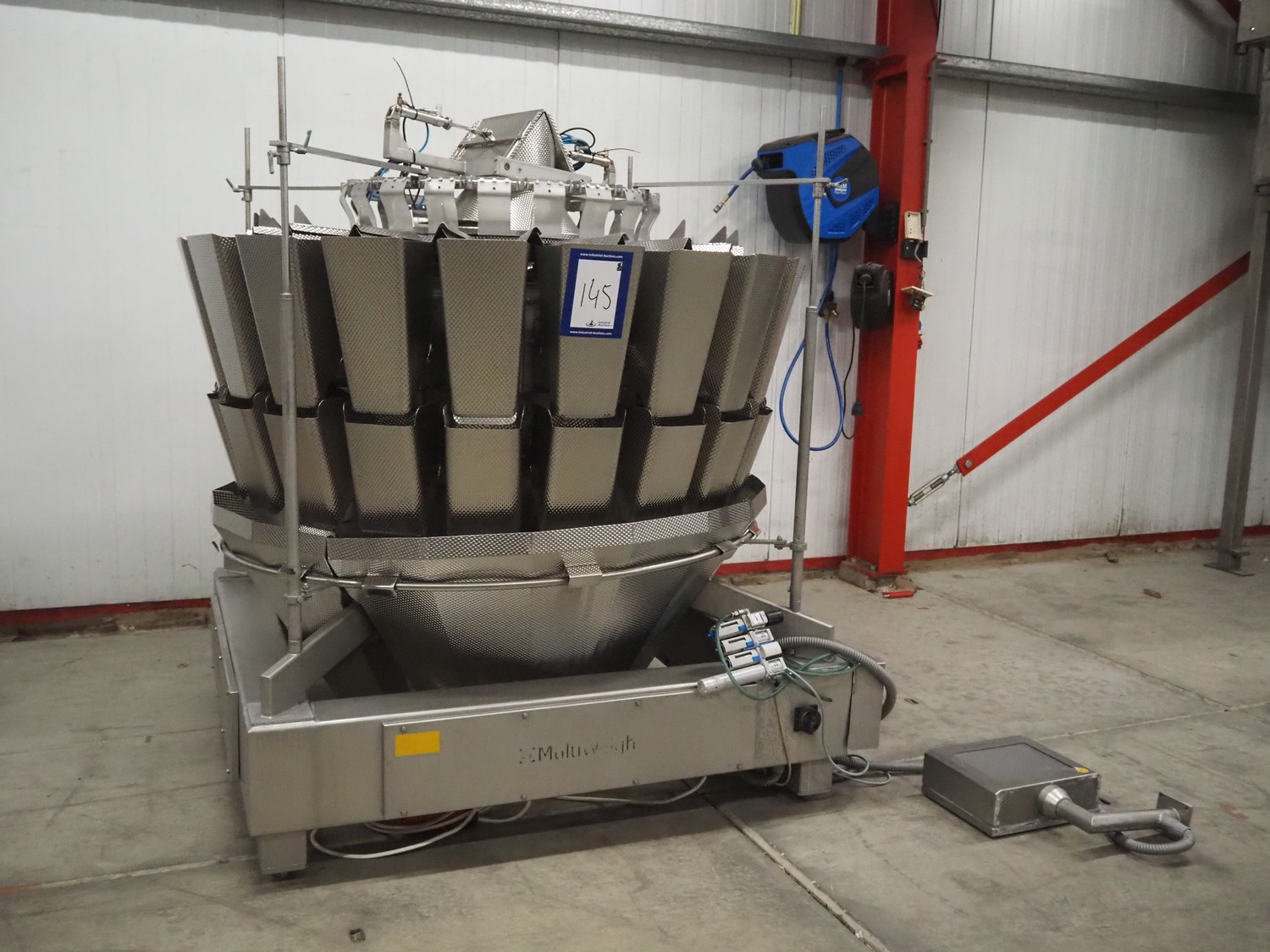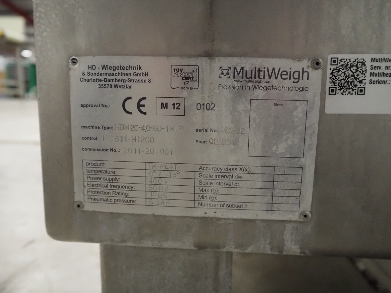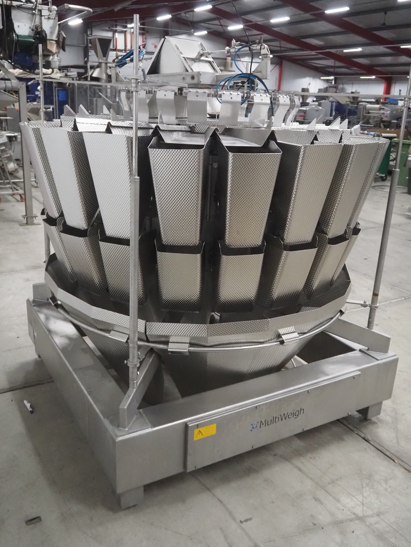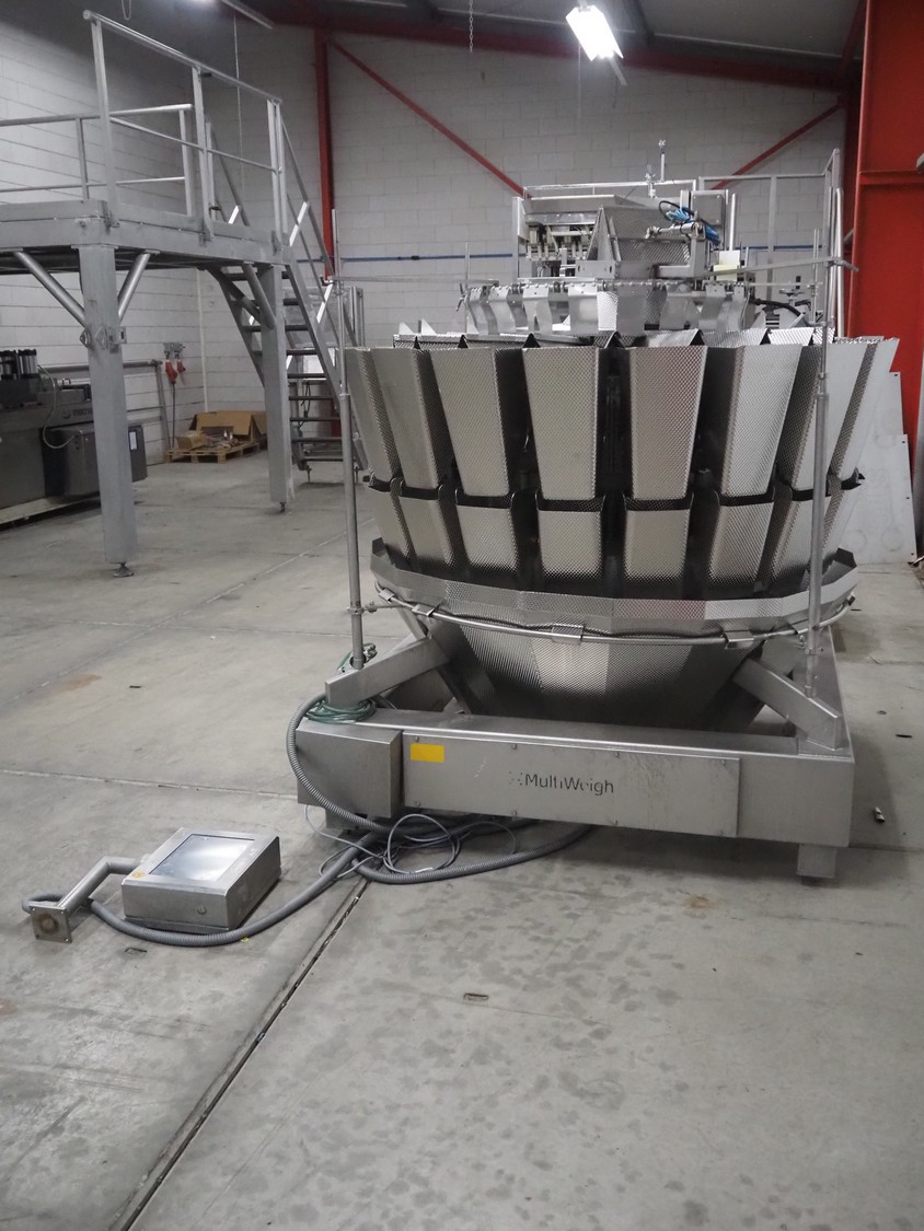 MultiWeigh 20-head multi head weigher, type: HDW20-4.0-60-TWIN, serial number: X0592, year of construction: 02.2012, 400 V, 50 Hz, weighing range: 230-5000 g, scale interval dw: 5.0 g, scale interval d: 10.0 g, temperature range: 0 C°-15 C°, dimensions: 1600 mm x 1600 mm x 1820 mm.