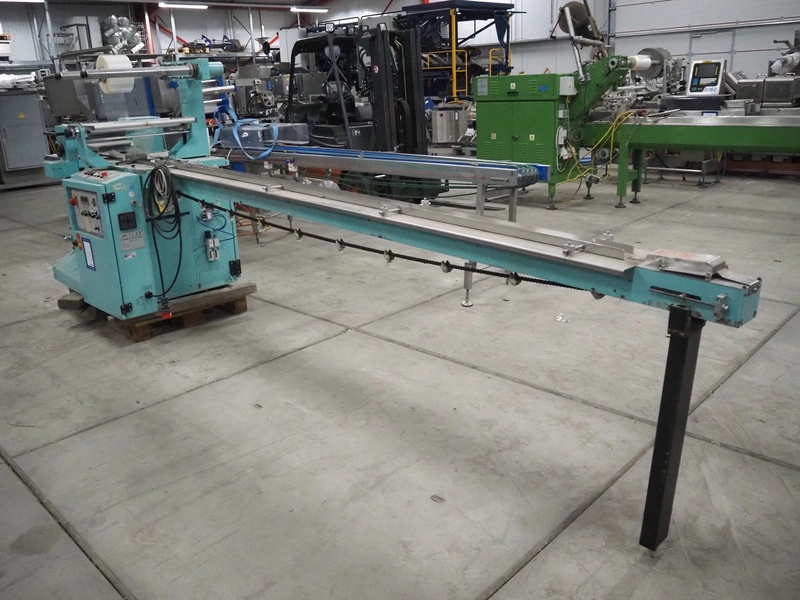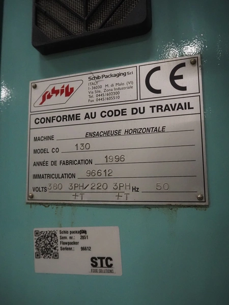 Schib Packaging S.r.l flowpacker, model: CO 130, number: 96612, year of construction: 1996, 380/220 V, 3 Ph, 50 Hz, dimensions: 5090 mm x 950 mm x 1700 mm.