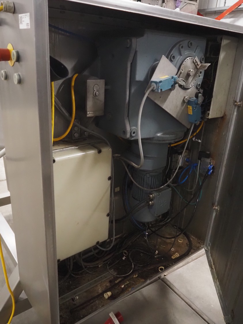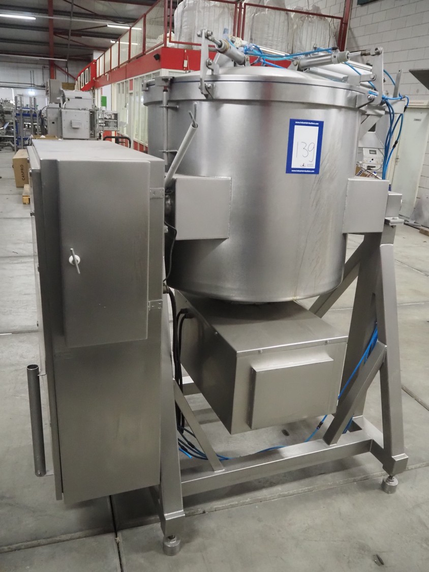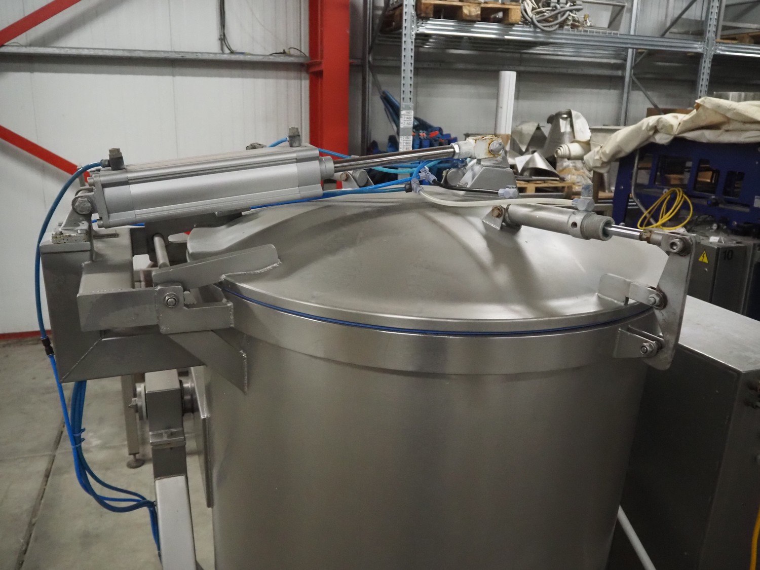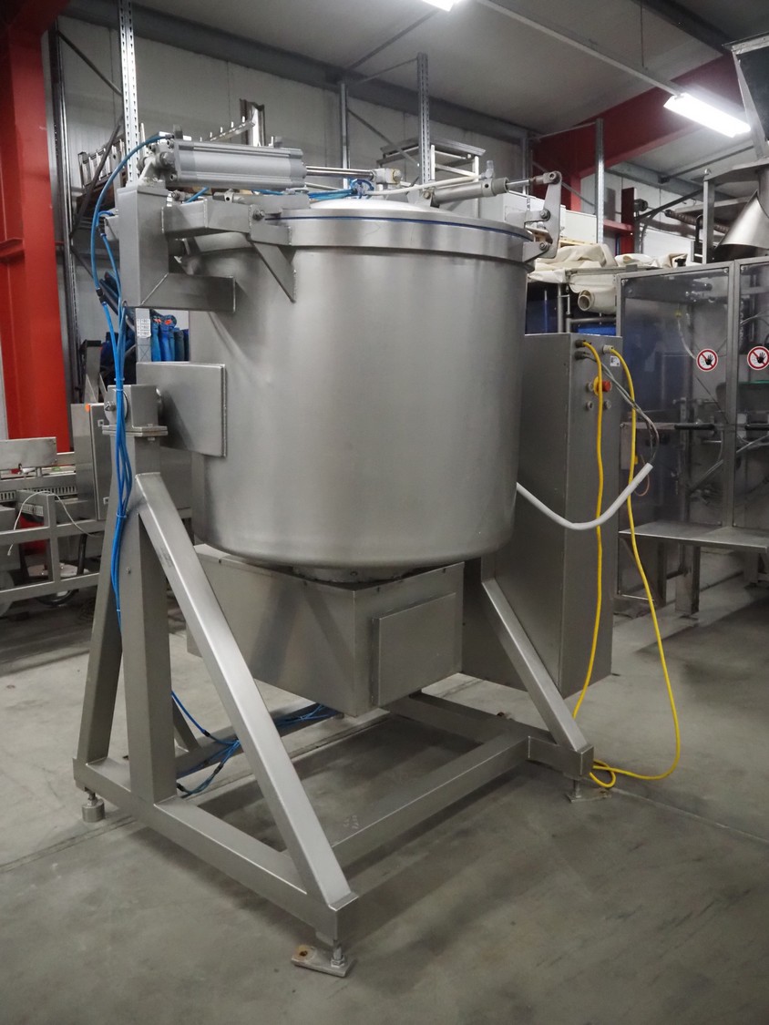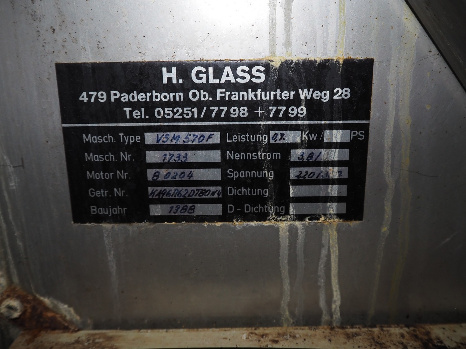 H. Glass tumbler with agitator with scrapers, type: VSM 570F, machine number: 1733, 220/380 V, 0.7 kW, inside dimensions: Ø 1000 mm x 850 mm, total dimensions: 1550 mm x 1250 mm x 1950 mm.