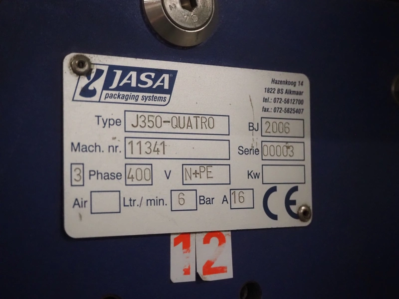 Jasa vertical form- fill- and seal machine, type: J350-QUATRO, machine number: 11341, year of construction: 2006, 400 V, 3 Ph, 16 A, funnel dimensions: 115 mm x 100 mm, vertical seal length: 360 mm, horizontal seal length: 280 mm, Markem-Imaje SmartDate X60 inkjet printer, total dimensions: 2050 mm x 1050 mm x 2100 mm.