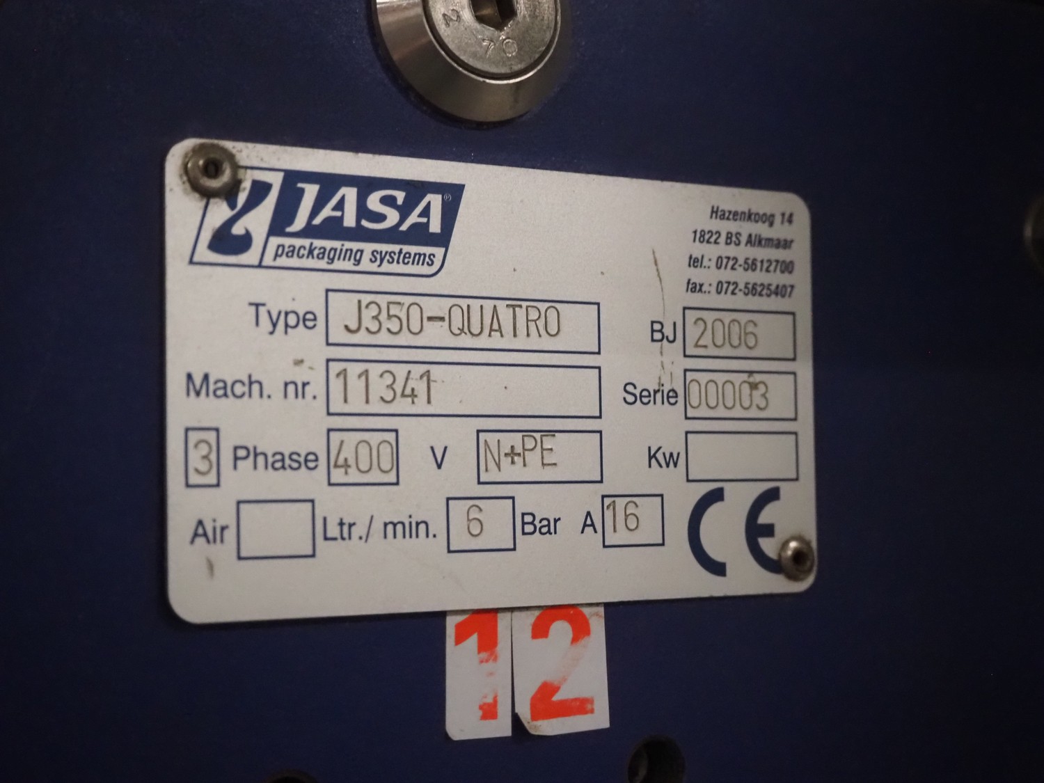 Jasa vertical form- fill- and seal machine, type: J350-QUATRO, machine number: 11341, year of construction: 2006, 400 V, 3 Ph, 16 A, funnel dimensions: 115 mm x 100 mm, vertical seal length: 360 mm, horizontal seal length: 280 mm, Markem-Imaje SmartDate X60 inkjet printer, total dimensions: 2050 mm x 1050 mm x 2100 mm.