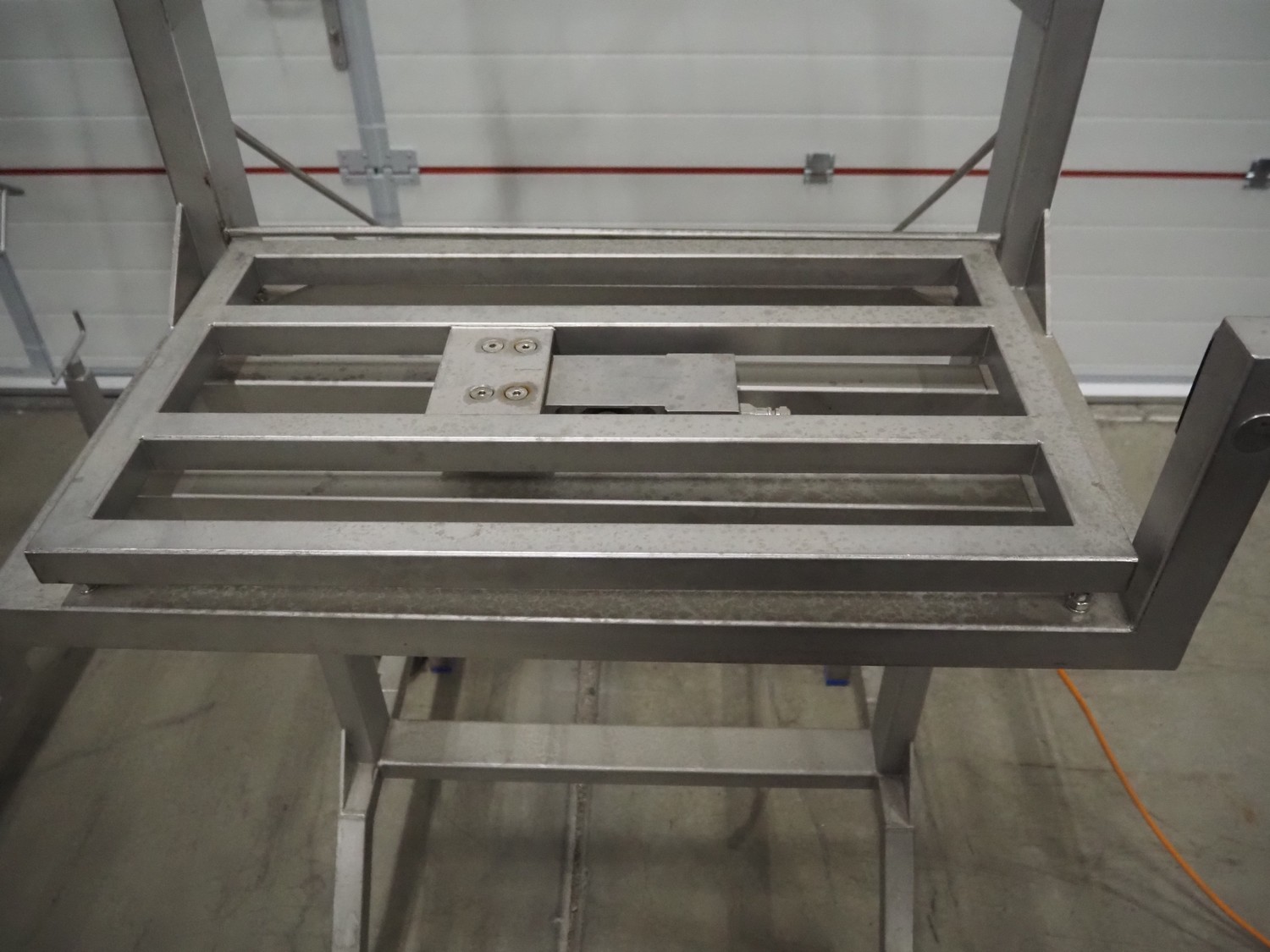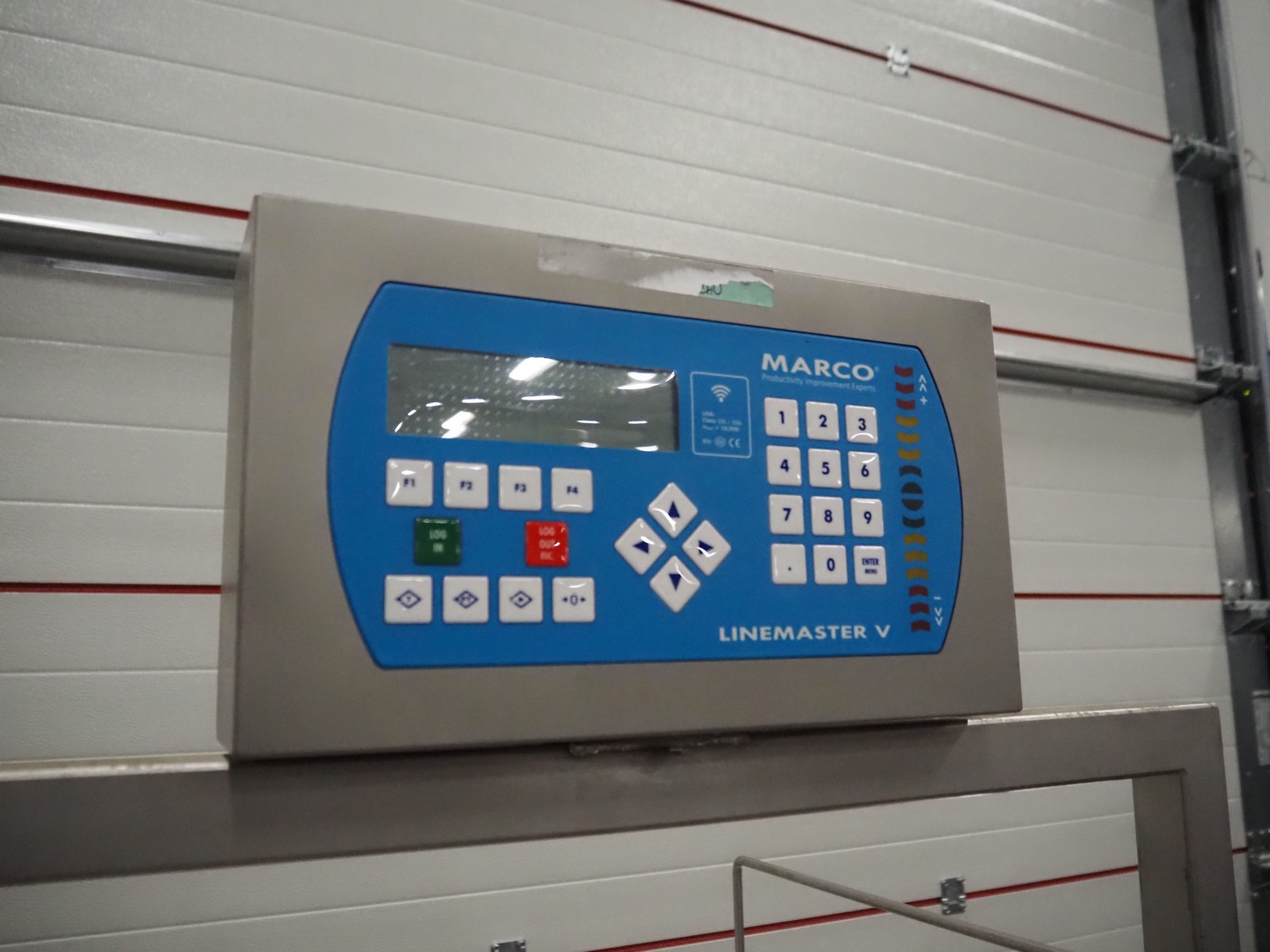 Marco weighing scale on s/s frame, model: LineMaster V, serial number: 226984, year of construction: 2017, 110-230 V, weighing range: 20-20000g, e=1g, dimensions scale: 440 mm x 400 mm, total dimensions: 1280 mm x 550 mm x 1780 mm.