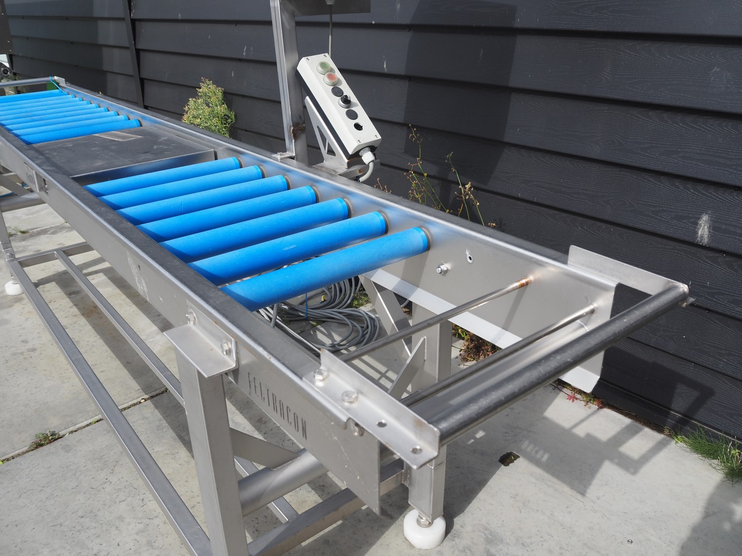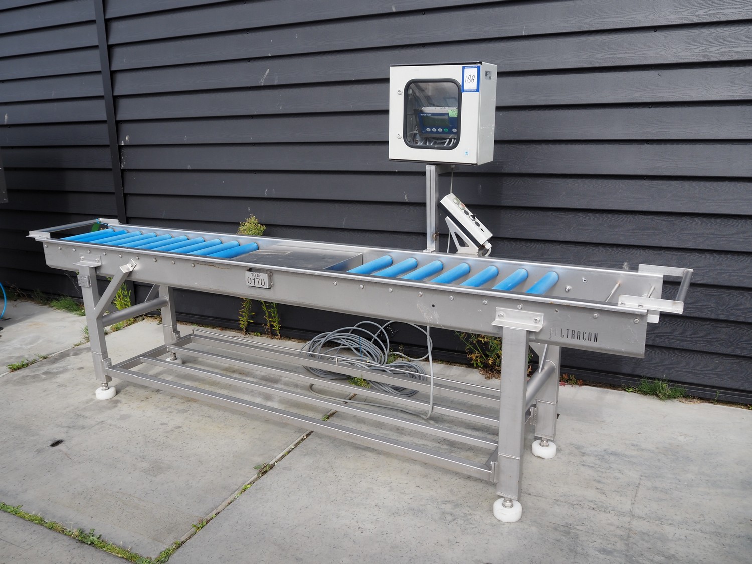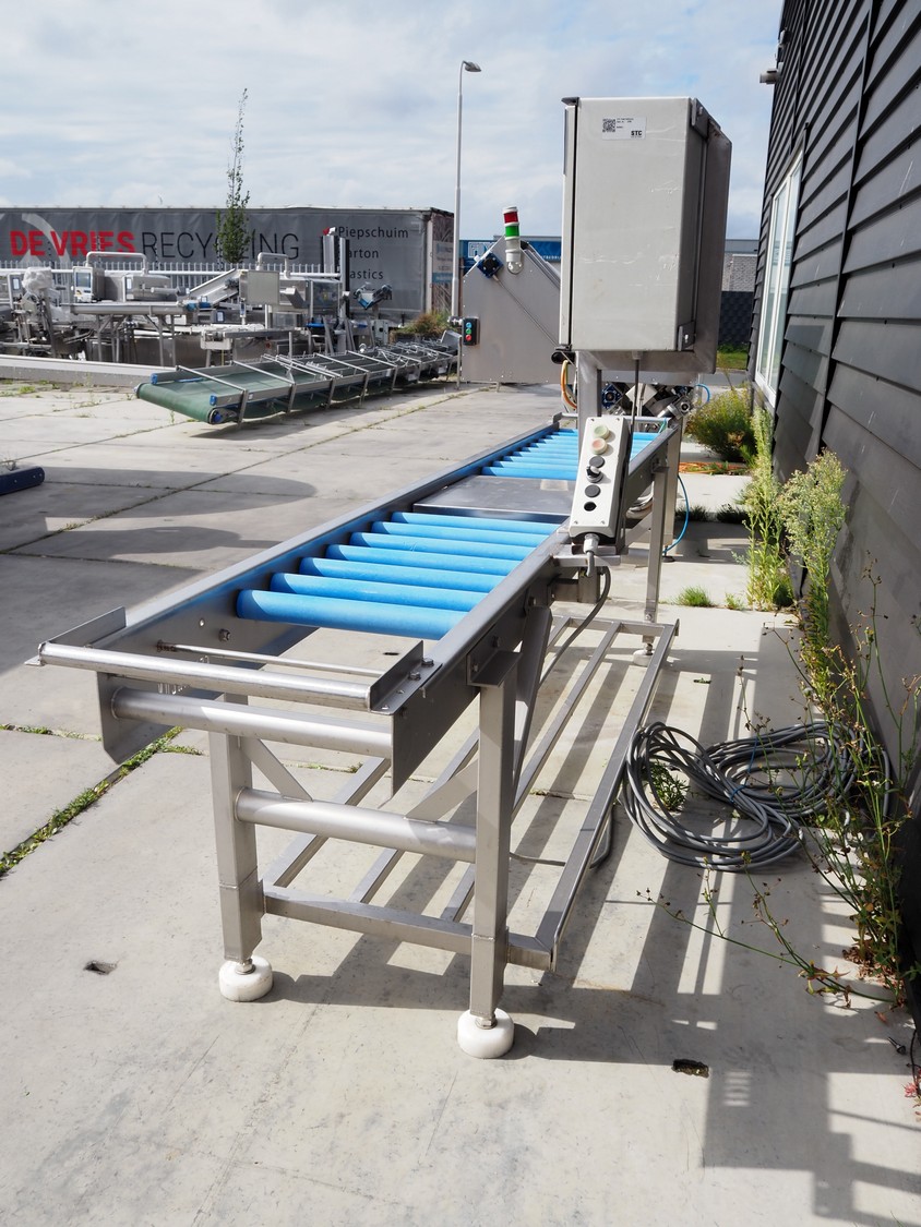 Feltracon roller conveyor with Mettler Toledo weighing scale, roller conveyor type: 72K, number: 3575-72K1, year of construction: 2008, plastic rollers, roller width: 410 mm, Mettler Toledo weighing scale type: ICS4x9-1, serial number: 3304966, total dimensions: 3160 mm x 750 mm x 1600 mm.