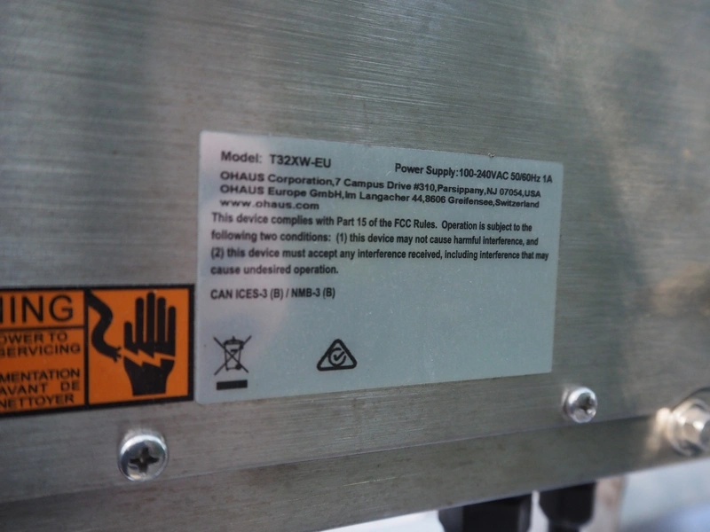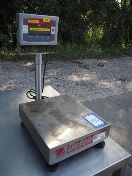 Ohaus weighing scale, model: T32XW, serial number: B919622653, 100/400 V, 50/60 Hz, 1 A, maximum: 15 kg, minimum: 0.1 kg, e= 0.005 kg, scale dimensions: 355 mm x 315 mm, total dimensions: 530 mm x 315 mm x 560 mm. Lot located on other location in Urk (NL). Viewing and pick-up in consultation with Industrial Auctions BV.