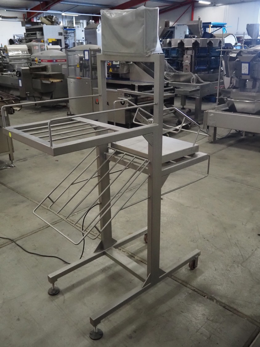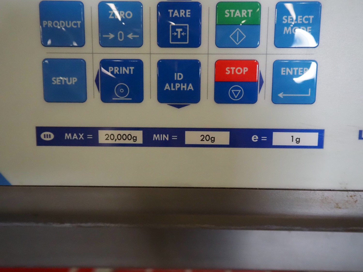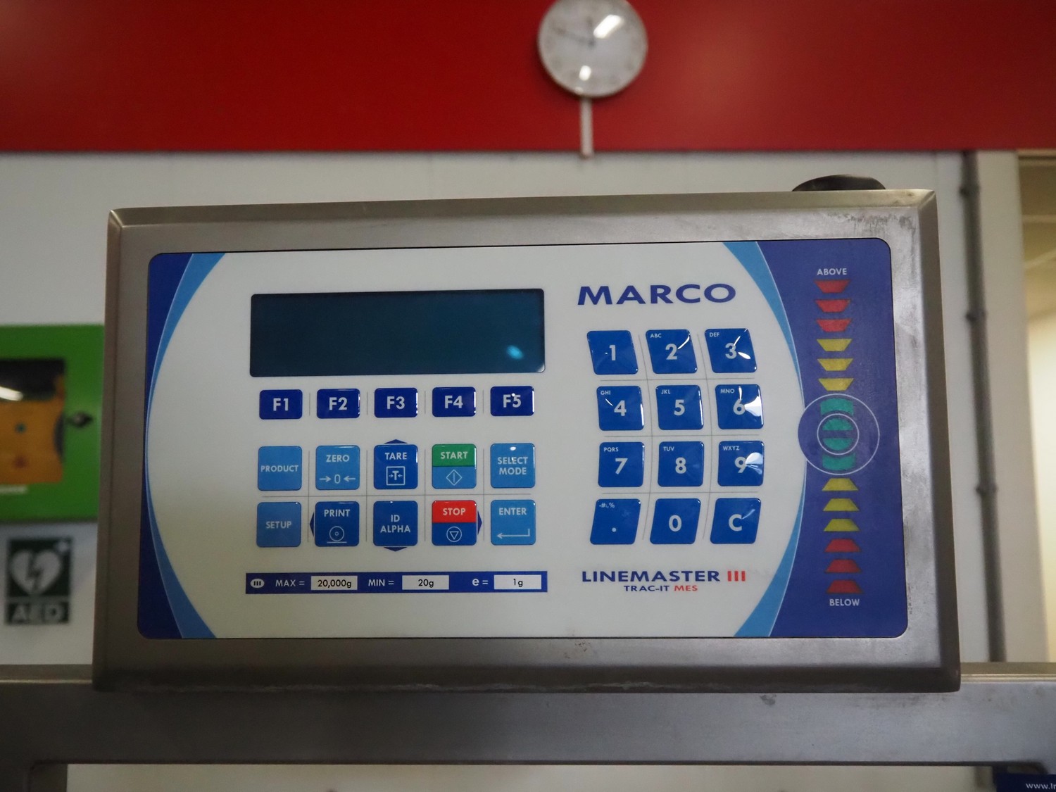 Marco weighing scale on s/s frame, model: LMIII, serial number: 49586, 90-250 V, 50-60 Hz, 0.8 A, maximum: 20000 gram, minimum: 20 gram, e= 1 gram, dimensions scale: 440 mm x 400 mm, total dimensions: 1280 mm x 550 mm x 1780 mm.