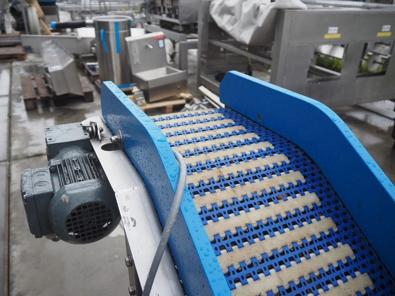 Elevating belt, plastic mesh belt, belt width: 340 mm, elevating height: 1000 mm, total dimensions: 3000 mm x 600 mm x 1150 mm.