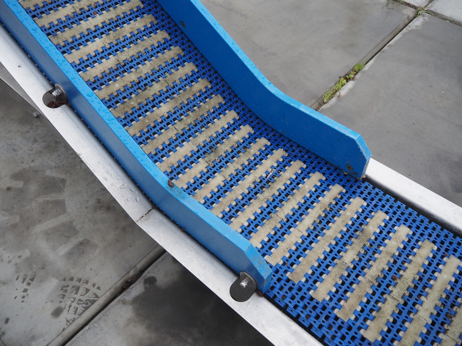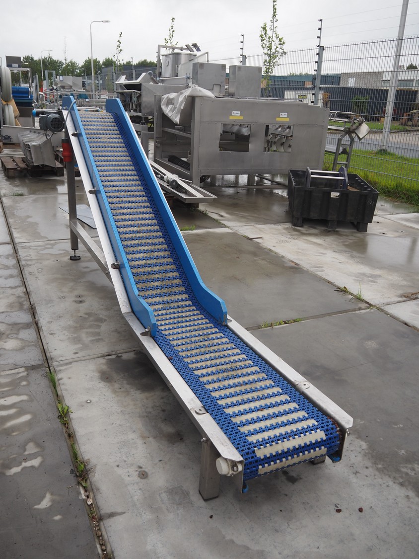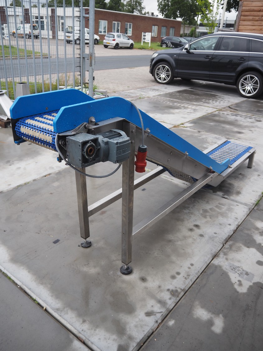 Elevating belt, plastic mesh belt, belt width: 340 mm, elevating height: 1000 mm, total dimensions: 3000 mm x 600 mm x 1150 mm.