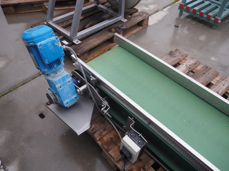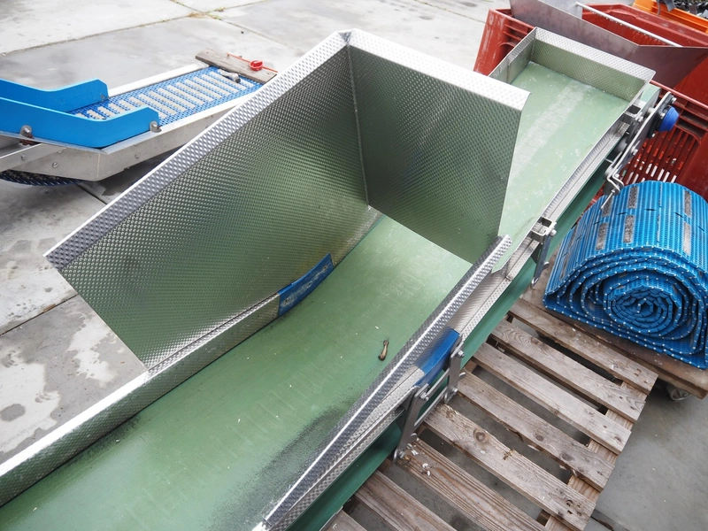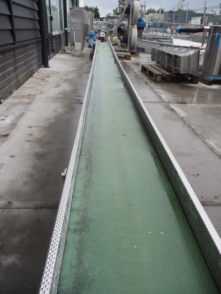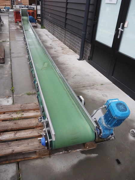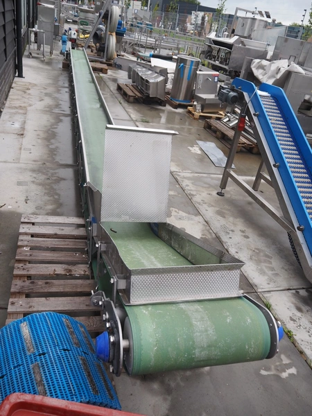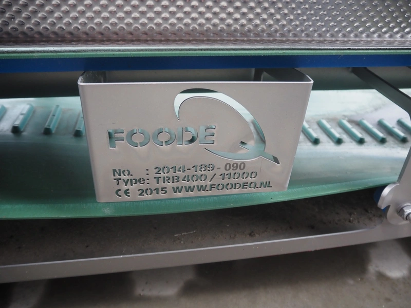 FOODEQ elevating belt, type: TRB 400/11000, number: 2014-189-090, year of construction: 2014, s/s frame, plastic belt, belt width: 400 mm, elevating height: 3740 mm, total dimensions: 11100 mm x 500 mm x 3860 mm.