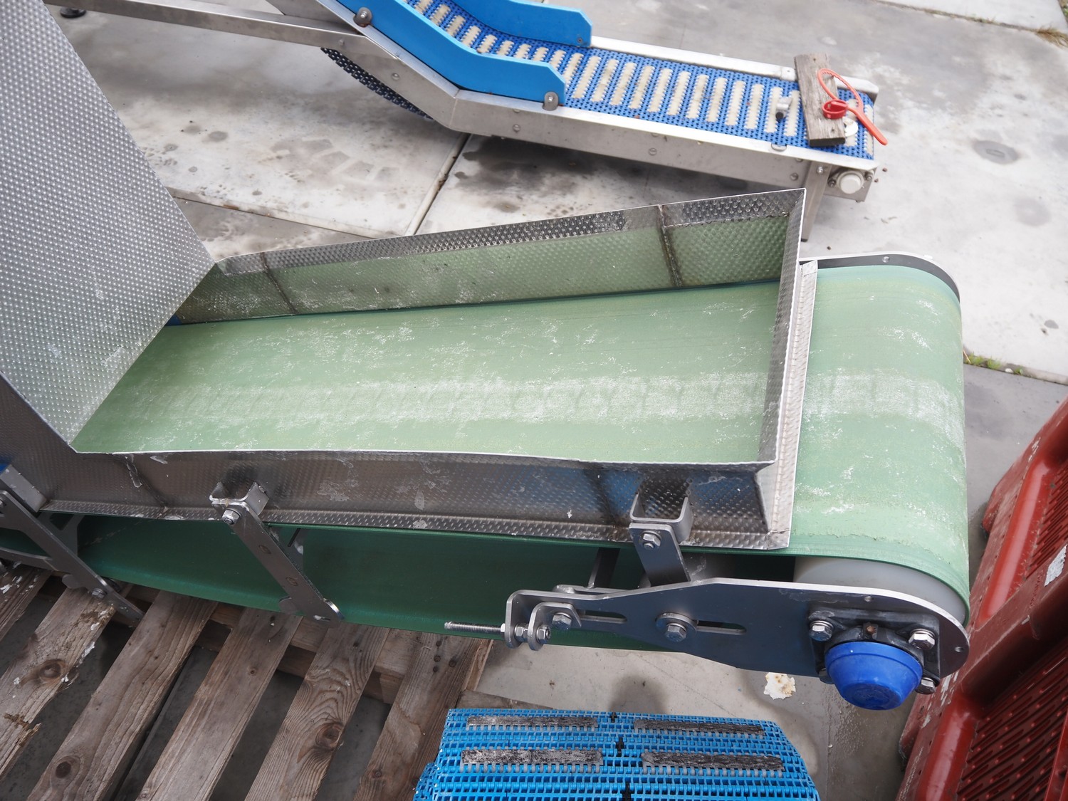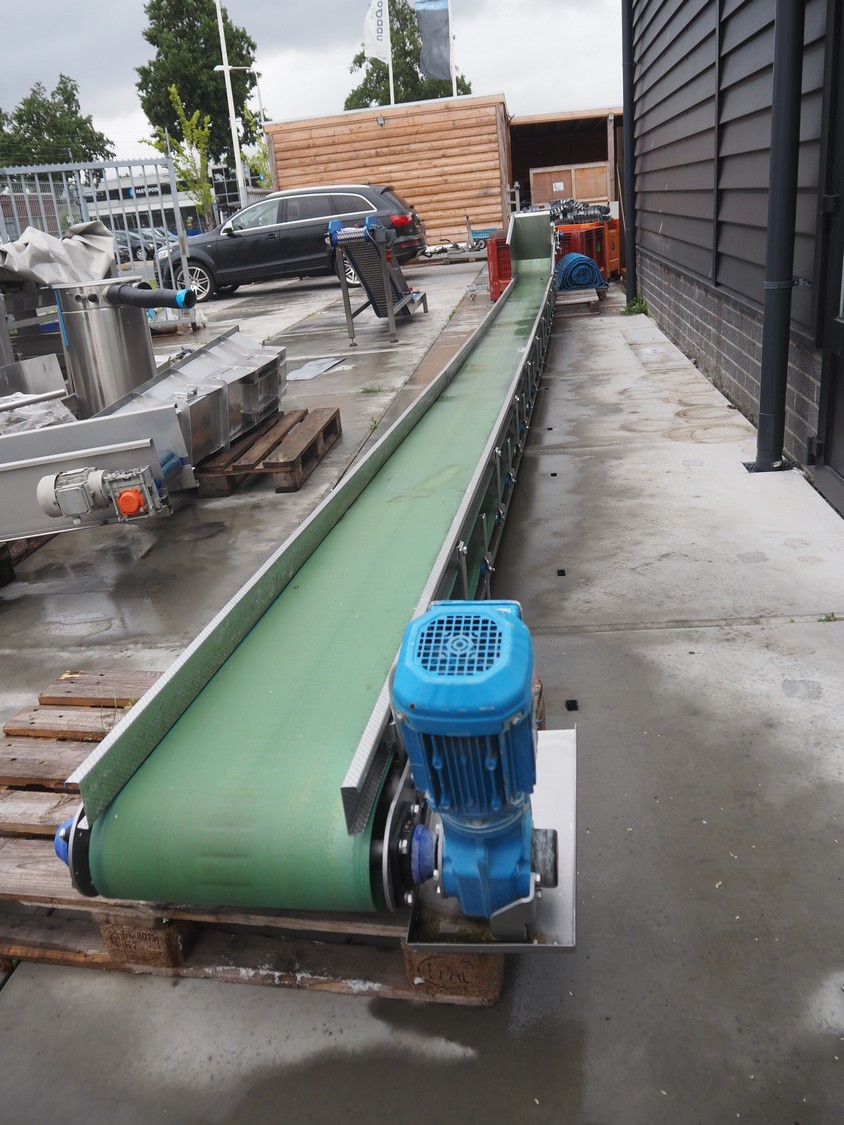 FOODEQ elevating belt, type: TRB 400/11000, number: 2014-189-090, year of construction: 2014, s/s frame, plastic belt, belt width: 400 mm, elevating height: 3740 mm, total dimensions: 11100 mm x 500 mm x 3860 mm.