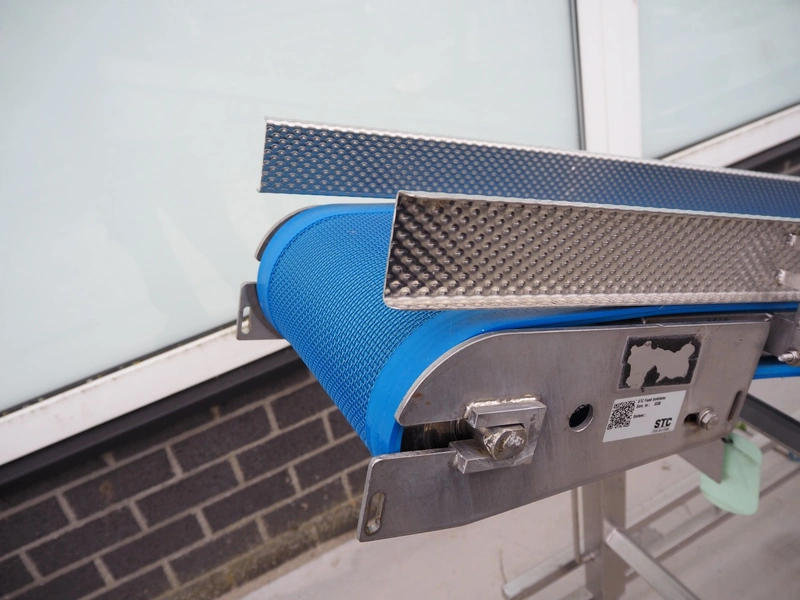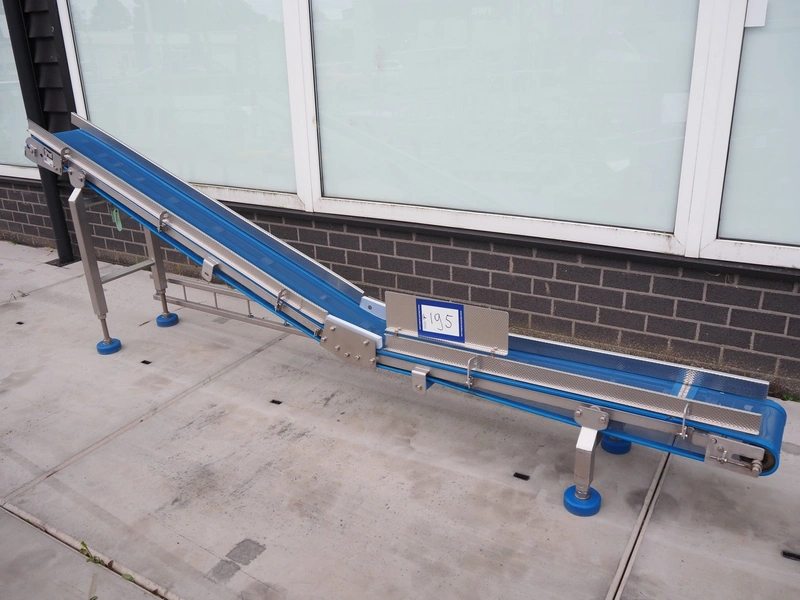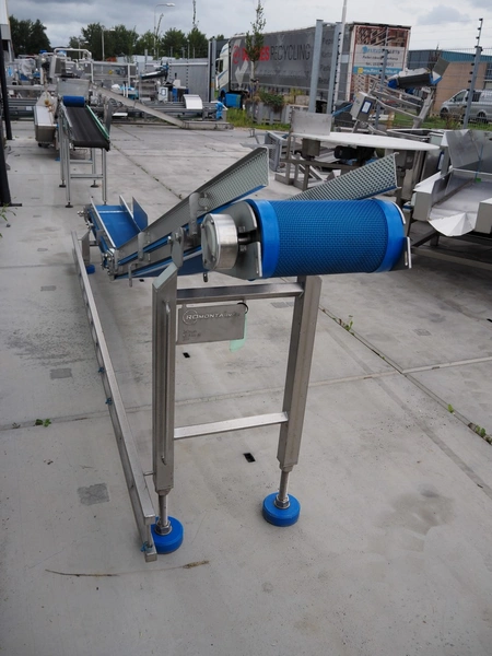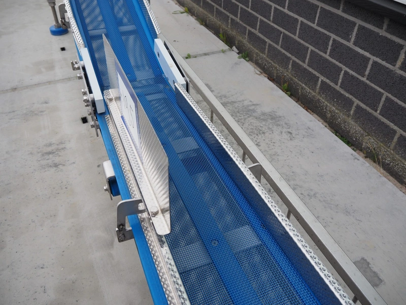 Romonta BV elevating belt, machine number: 7, year of construction: 2012, plastic sieve belt, belt width: 270 mm, elevating height: 1050 mm, total dimensions: 3600 mm x 450 mm x 1180 mm.