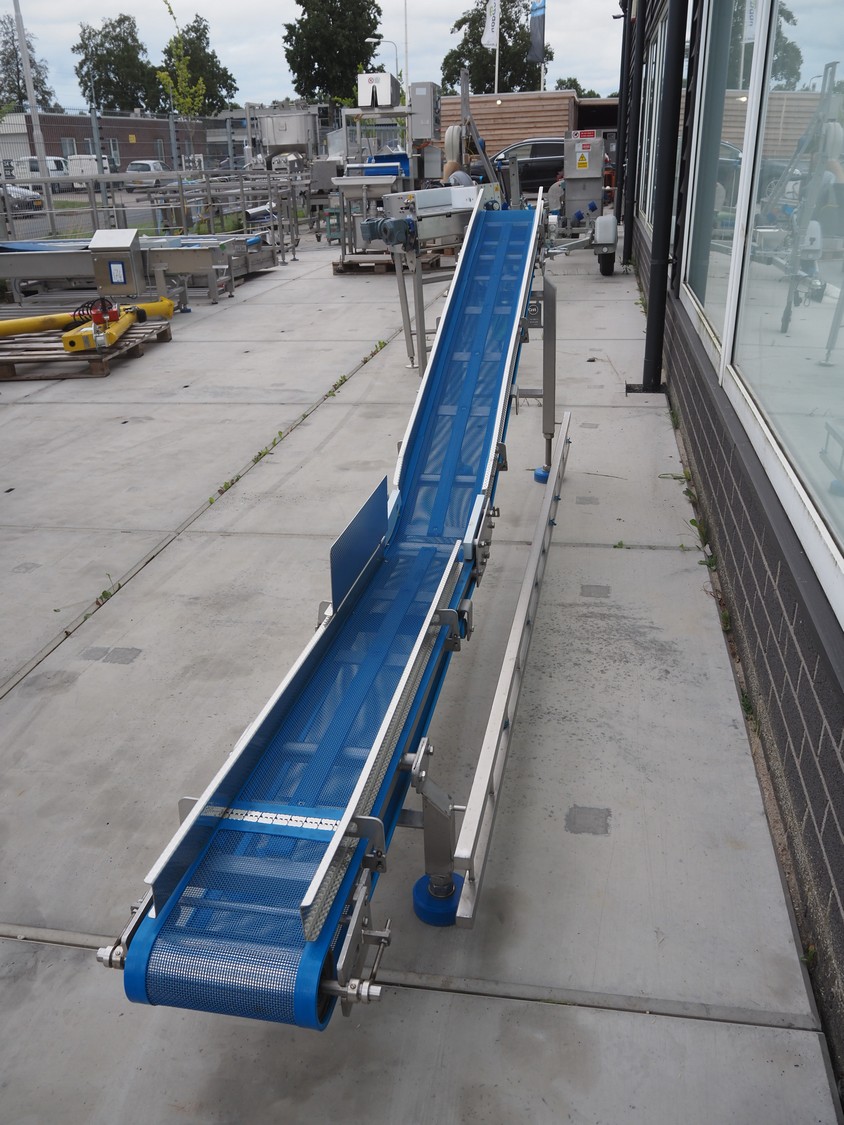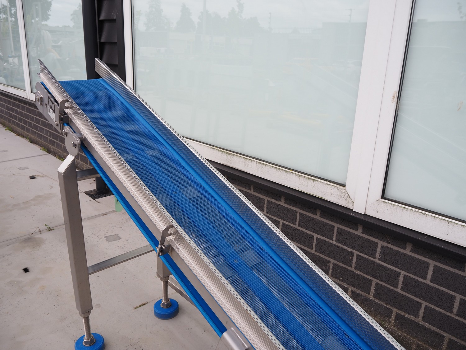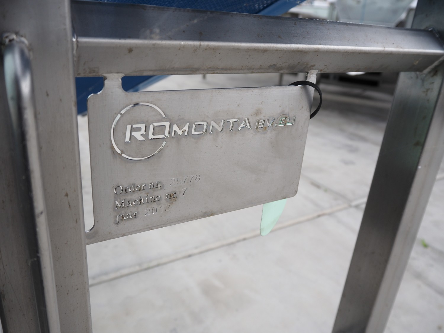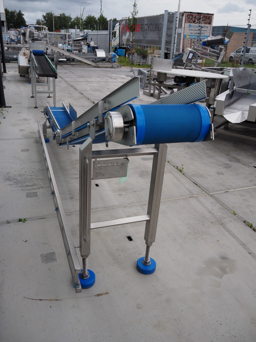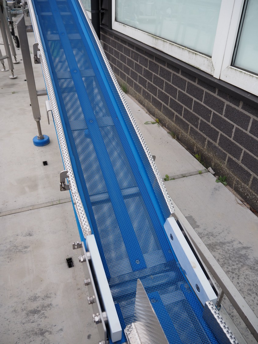 Romonta BV elevating belt, machine number: 7, year of construction: 2012, plastic sieve belt, belt width: 270 mm, elevating height: 1050 mm, total dimensions: 3600 mm x 450 mm x 1180 mm.