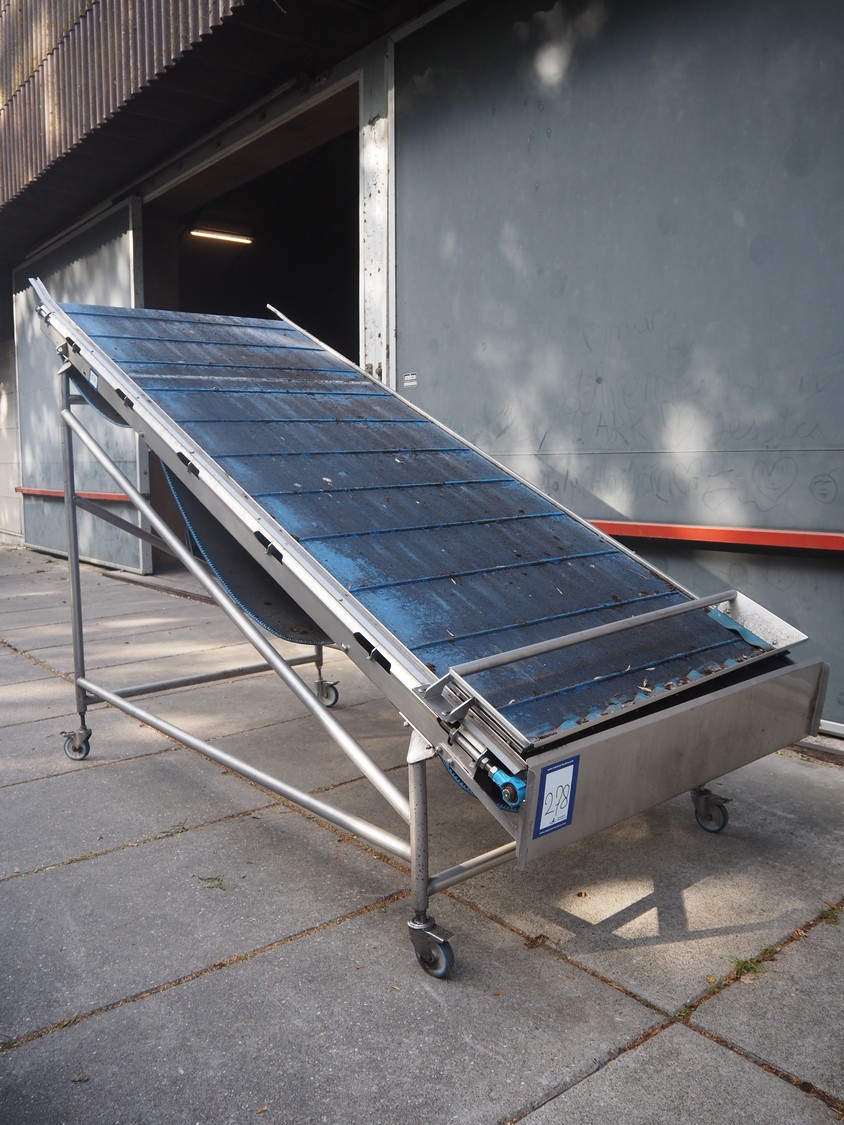 Mobile elevating belt, plastic belt, belt width: 1320 mm, elevating height: 2220 mm, total dimensions: 3200 mm x 1550 mm x 2400 mm. Lot located on other location in Urk (NL). Viewing and pick-up in consultation with Industrial Auctions BV.
