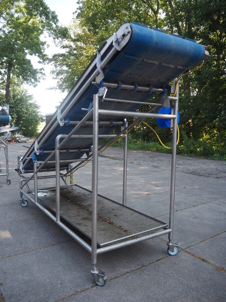 Lumacon mobile elevating belt, type: RC850x3650 Easy clean, serial number: 21-00298-009, year of construction: 2021, speed: 0.16 m/sec, plastic belt with dividers, belt width: 850 mm, distance between dividers: 315 mm, divider height: 20 mm, elevating height: 2200 mm, total dimensions: 3400 mm x 1100 mm x 2300 mm. Lot located on other location in Urk (NL). Viewing and pick-up in consultation with Industrial Auctions BV.