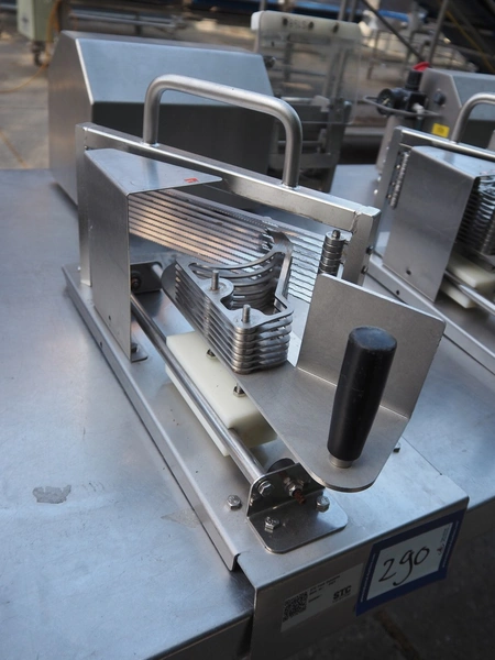 JBI A/S manual tomato slicer, dimensions: 200 mm x 550 mm x 300 mm. Some knives are broken. Lot located on other location in Urk (NL). Viewing and pick-up in consultation with Industrial Auctions BV.