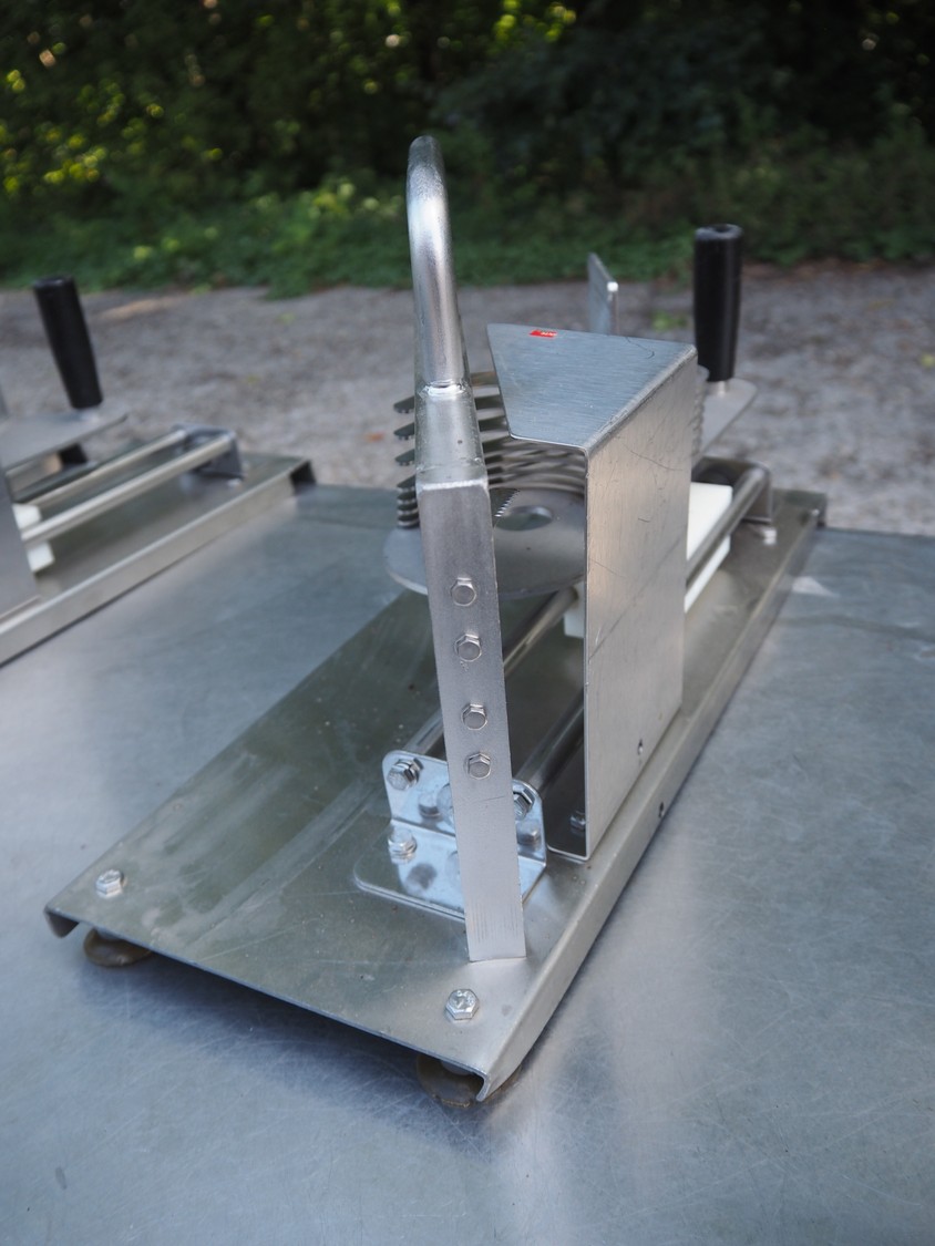 JBI A/S manual tomato slicer, dimensions: 200 mm x 550 mm x 300 mm. Some knives are broken. Lot located on other location in Urk (NL). Viewing and pick-up in consultation with Industrial Auctions BV.