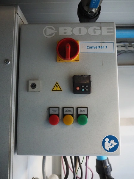 Boge Kompressoren screw air compressor with bluecat and air dryer, screw compressor type: SDF 100-3, machine number: 5136272, year of construction: 2018, 75+2.20 kW, 10 bar, capacity: 2.58/11.00 m³ per hour, dimensions: 2100 mm x 1100 mm x 1950 mm, bluecat type: BC160V, serial number: SV15-049, year of construction: 2019, 400 V, 10 kW, 16 bar, dimensions: 1650 mm x 950 mm x 2120 mm. Lot located in Best (NL). Viewing and pick-up in consultation with Industrial Auctions BV.