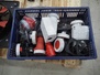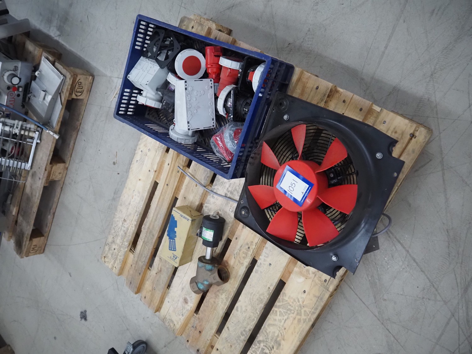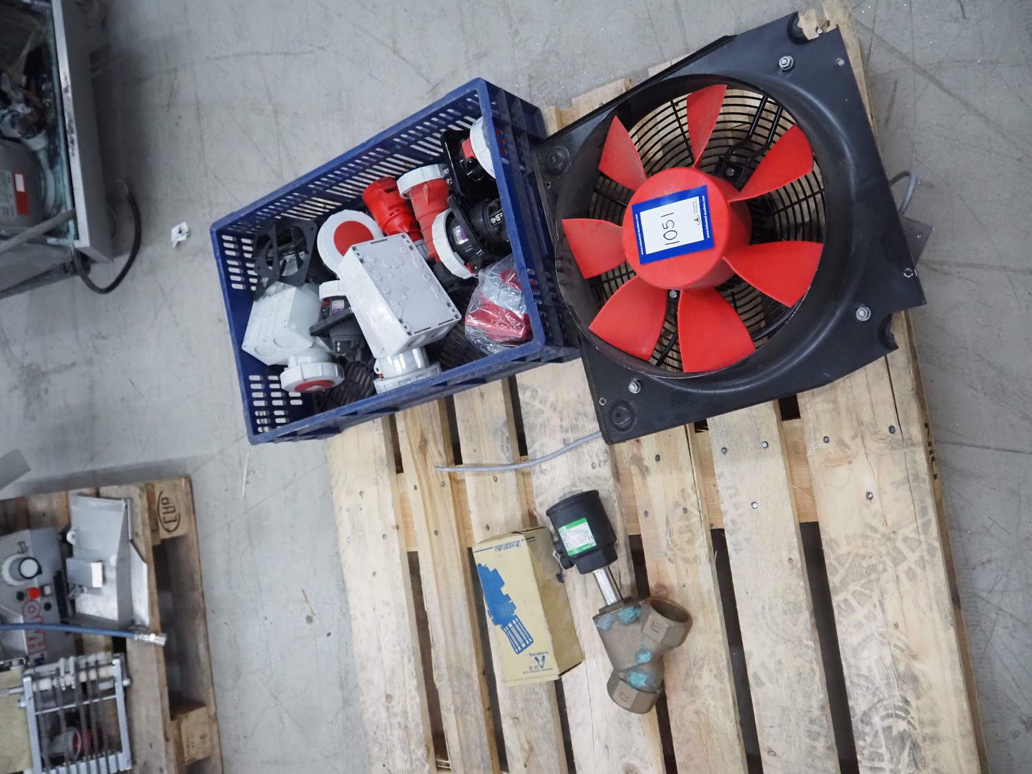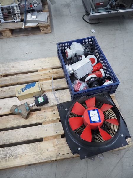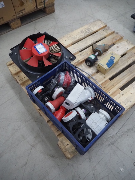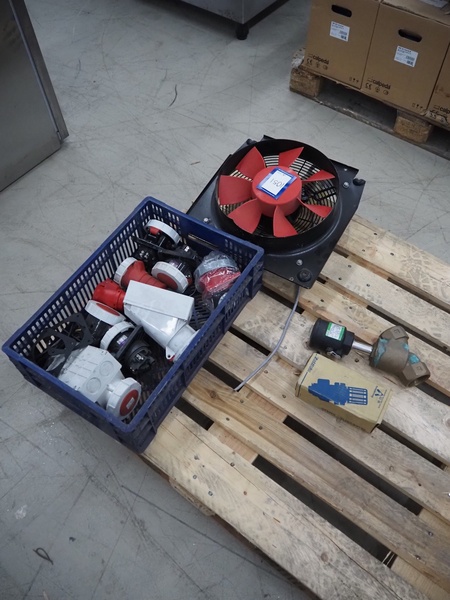 Plastic crate with various parts, fan, type fan: HCFB/4-355/H-A and various electric plugs.
