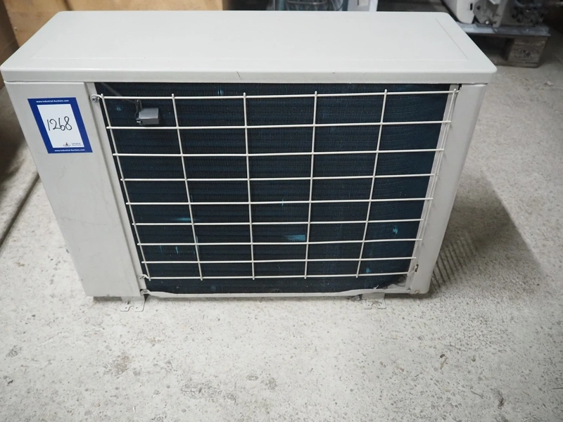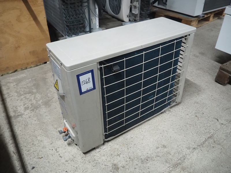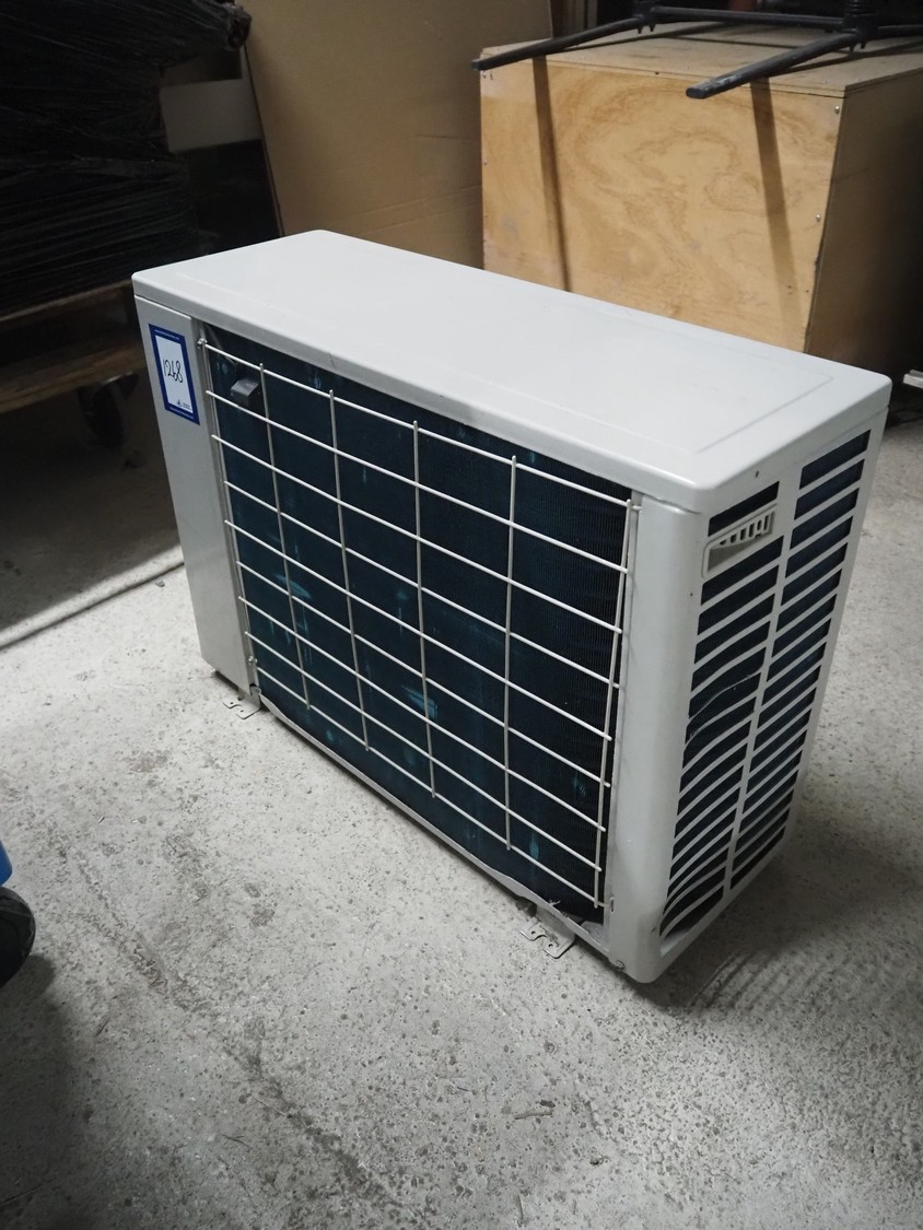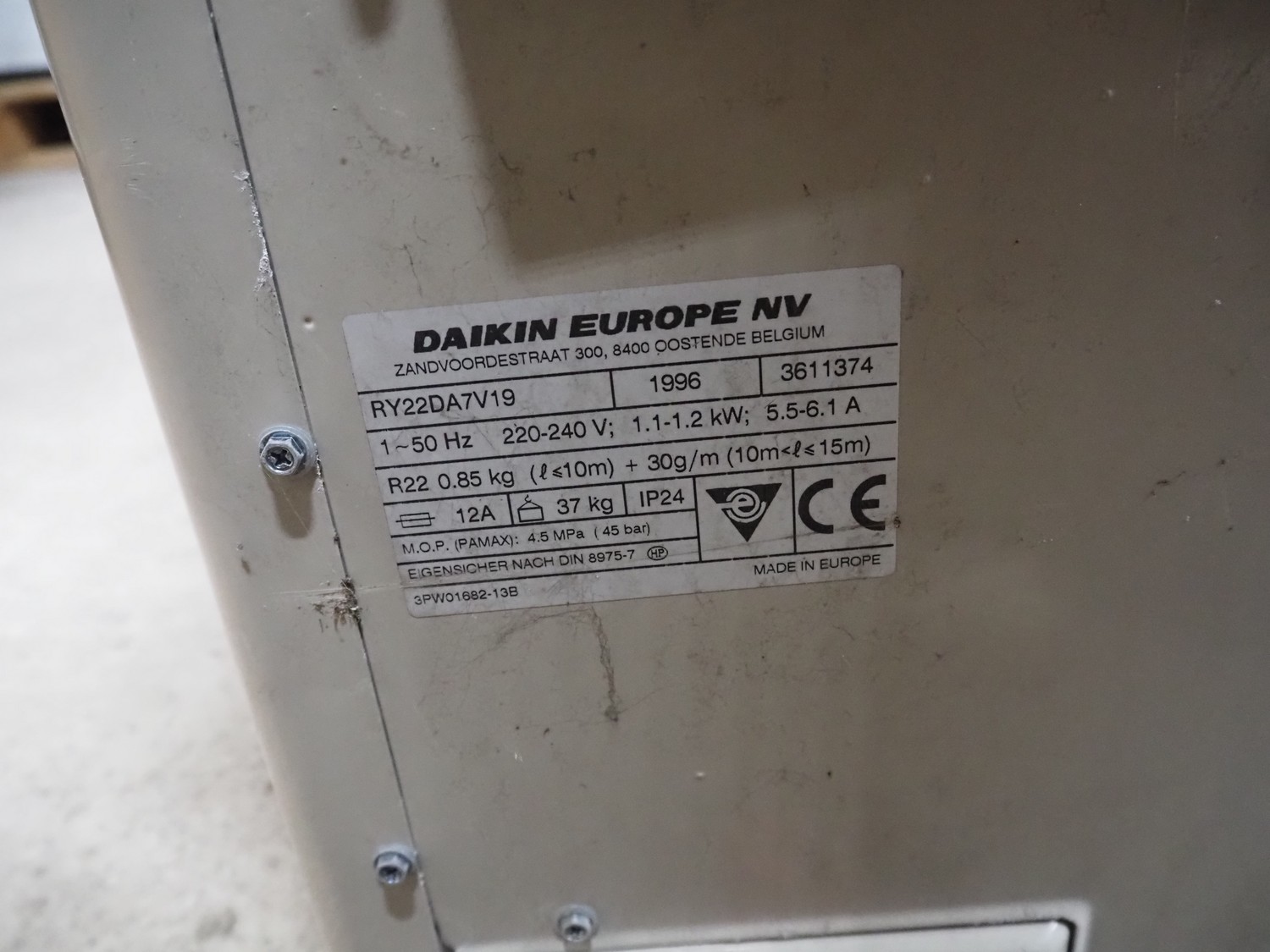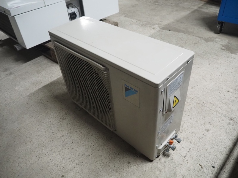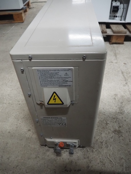 Daikin Europe NV condensing unit for air conditioning, model: RY22DA7V19, number: 3611374, year of construction: 1996, 220/240 V, 1 Ph, 50 Hz, 5.5/6.1 A, 1.1/1.2 kW, refrigerant: R22, 0.85 kg, dimensions: 750 mm x 300 mm x 550 mm.