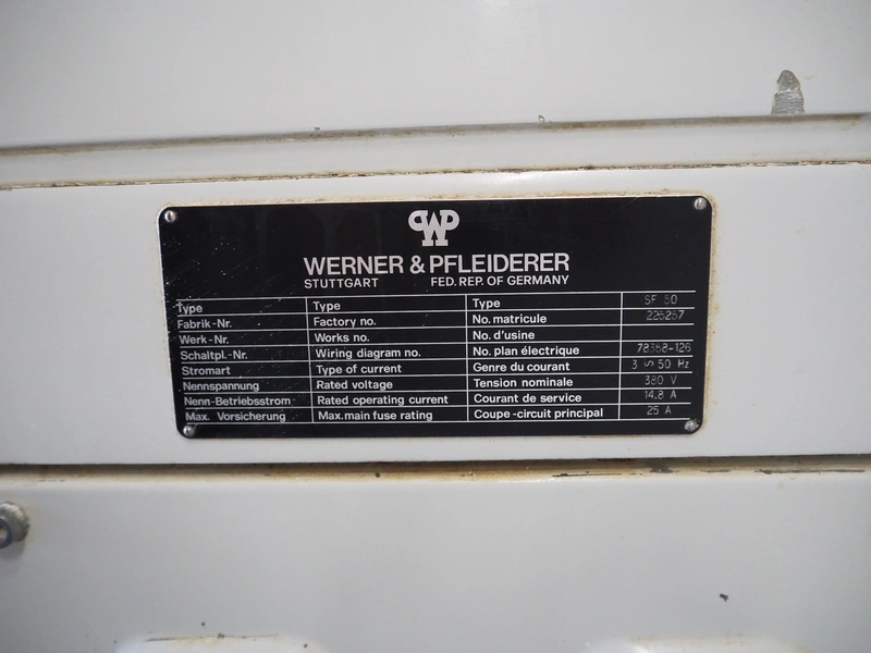WP Haton mixer, type: SF 50, fabrication number: 225257, 400 V, 3 Ph, 50 Hz, 14.8 A, s/s bowl, dough hook, inside dimensions: ø 630 mm x 380 mm, total dimensions: 1000 mm x 700 mm x 1300 mm.