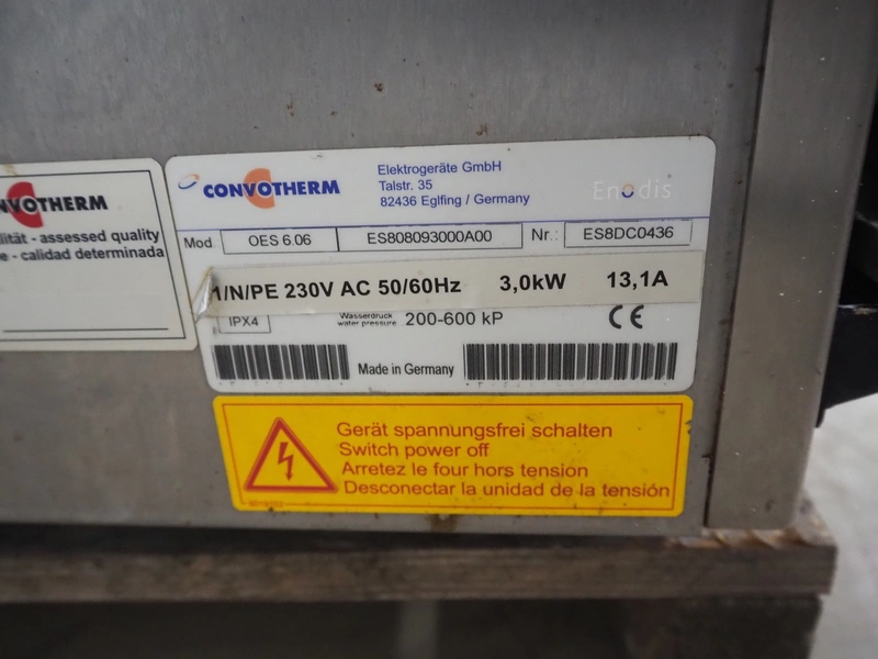 Convotherm oven, model: OES 6.06, number: ES8DC0436, 230 V, 1 Ph, 50/60 Hz, 13.1 A, 3.0 kW, 12 floors, dimensions each floor: 325 mm x 325 mm, total dimensions: 650 mm x 620 mm x 730 mm. Technical condition unknown.