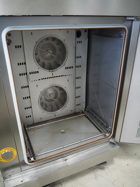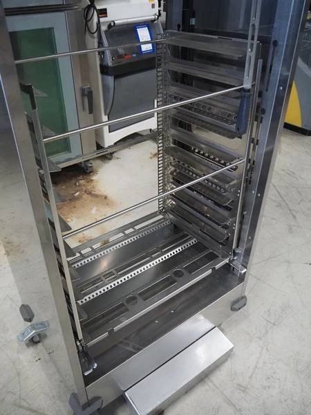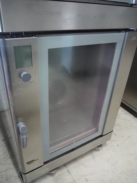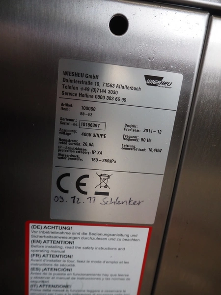 Wiesheu GmbH double stacked oven, model top oven: B4-E2, serial number: 10186400, 400 V, 3 Ph, 50 Hz, 13 A, 9.2 kW, year of construction: 12/2011, inside dimensions: 700 mm x 400 mm x 450 mm, model bottom oven: B8-E2, serial number: 10186397, year of construction: 12/2011, 400 V, 3 Ph, 50 Hz, 26.6 A, 18.4 kW, inside dimensions: 700 mm x 400 mm x850 mm, total dimensions: 1150 mm x 950 mm x 2140 mm. With Wiesheu GmbH s/s loading trolley, serial number: 18428144, year of construction: 07/2019, 14 floors, floor dimensions: 600 mm x 370 mm, total dimensions: 740 mm x 600 mm x 1930 mm.