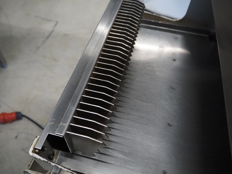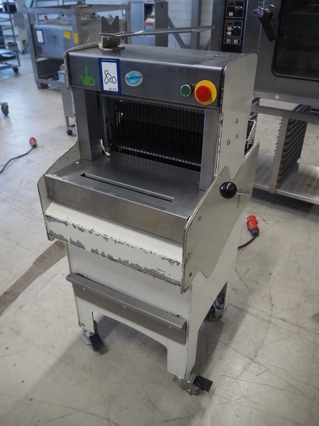 VLB mobile bread slicer, type: A Wave, number: 5802, year of construction: 2006, 230/400 V, 50 Hz, 0.56 kW, 30 knives, distance between knives: 10 mm, total dimensions: 750 mm x 630 mm x 1280 mm.