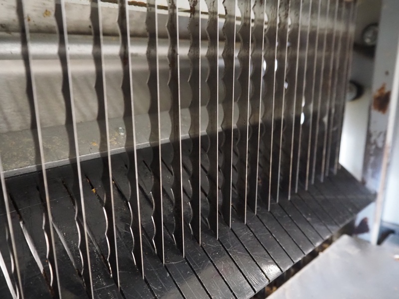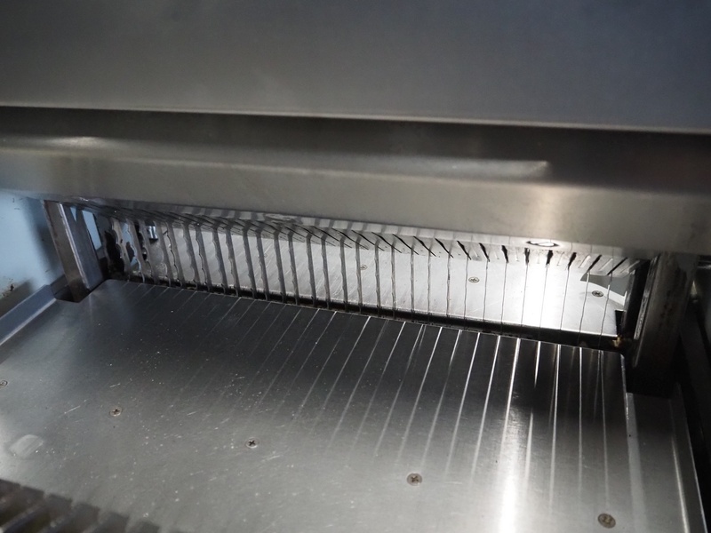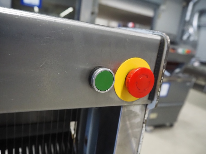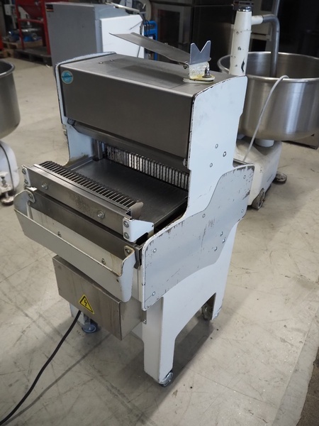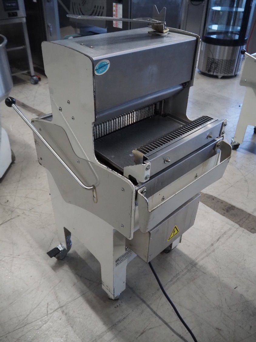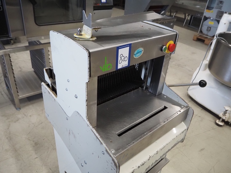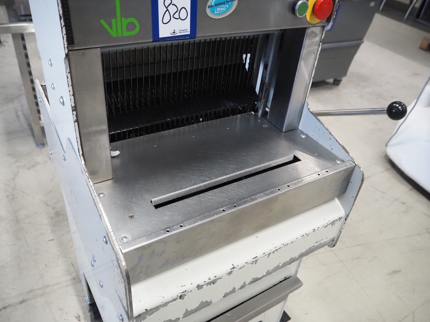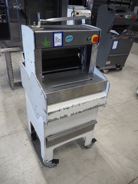 VLB mobile bread slicer, type: A Wave, number: 5802, year of construction: 2006, 230/400 V, 50 Hz, 0.56 kW, 30 knives, distance between knives: 10 mm, total dimensions: 750 mm x 630 mm x 1280 mm.
